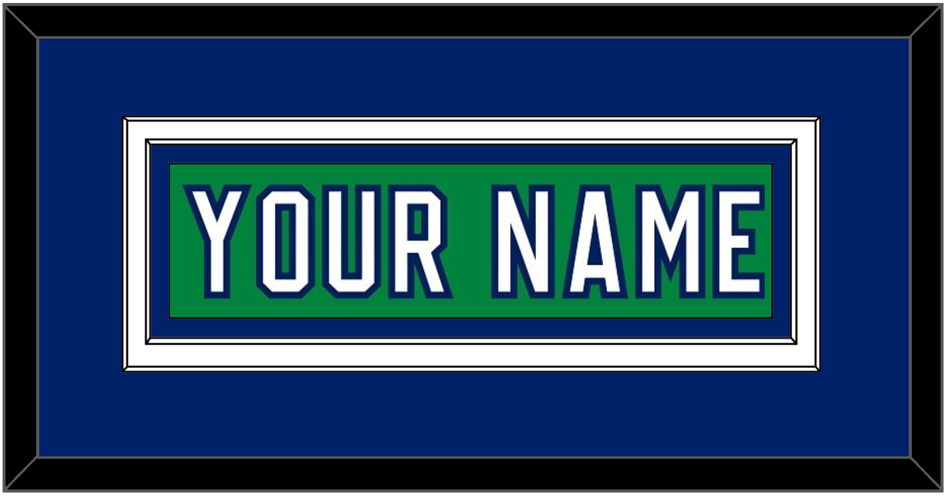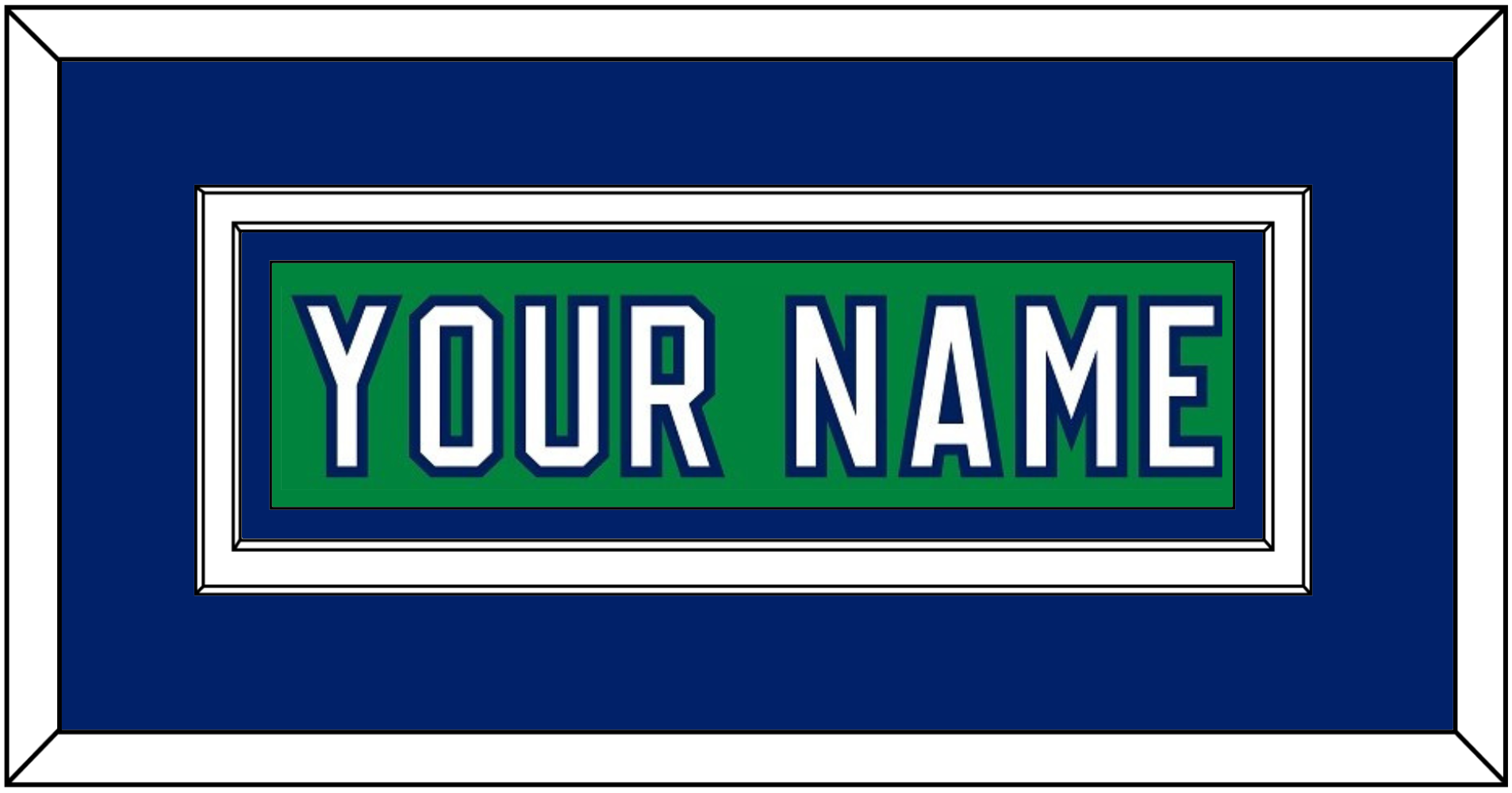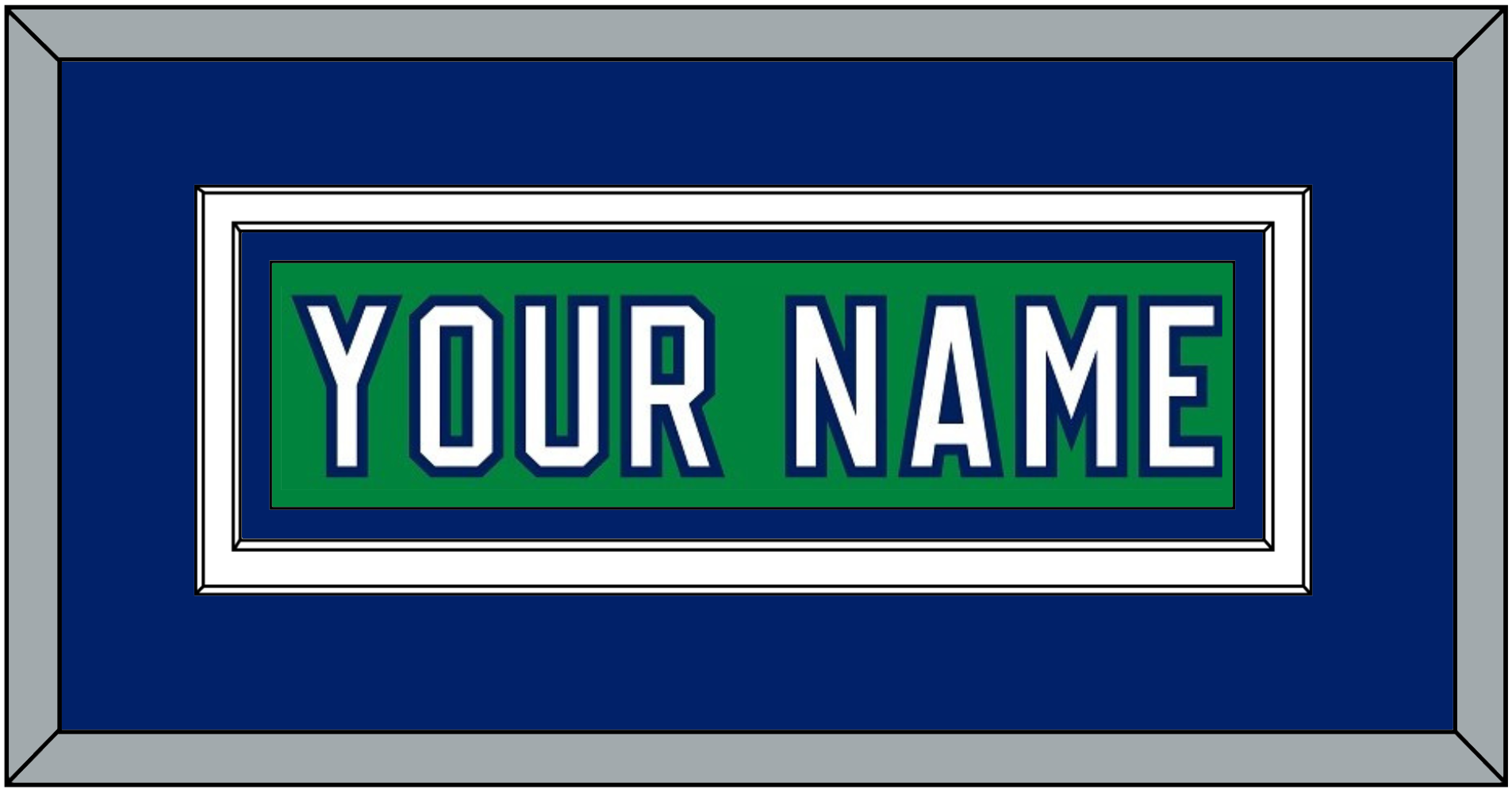 Carolina Heritage Green Jersey (2018 Through 2023) Nameplate. Double Mat: Blue Mat Over White Mat, Green Nameplate Mounted On Blue Mat. White, Black Or Silver (Metal) Frame.
