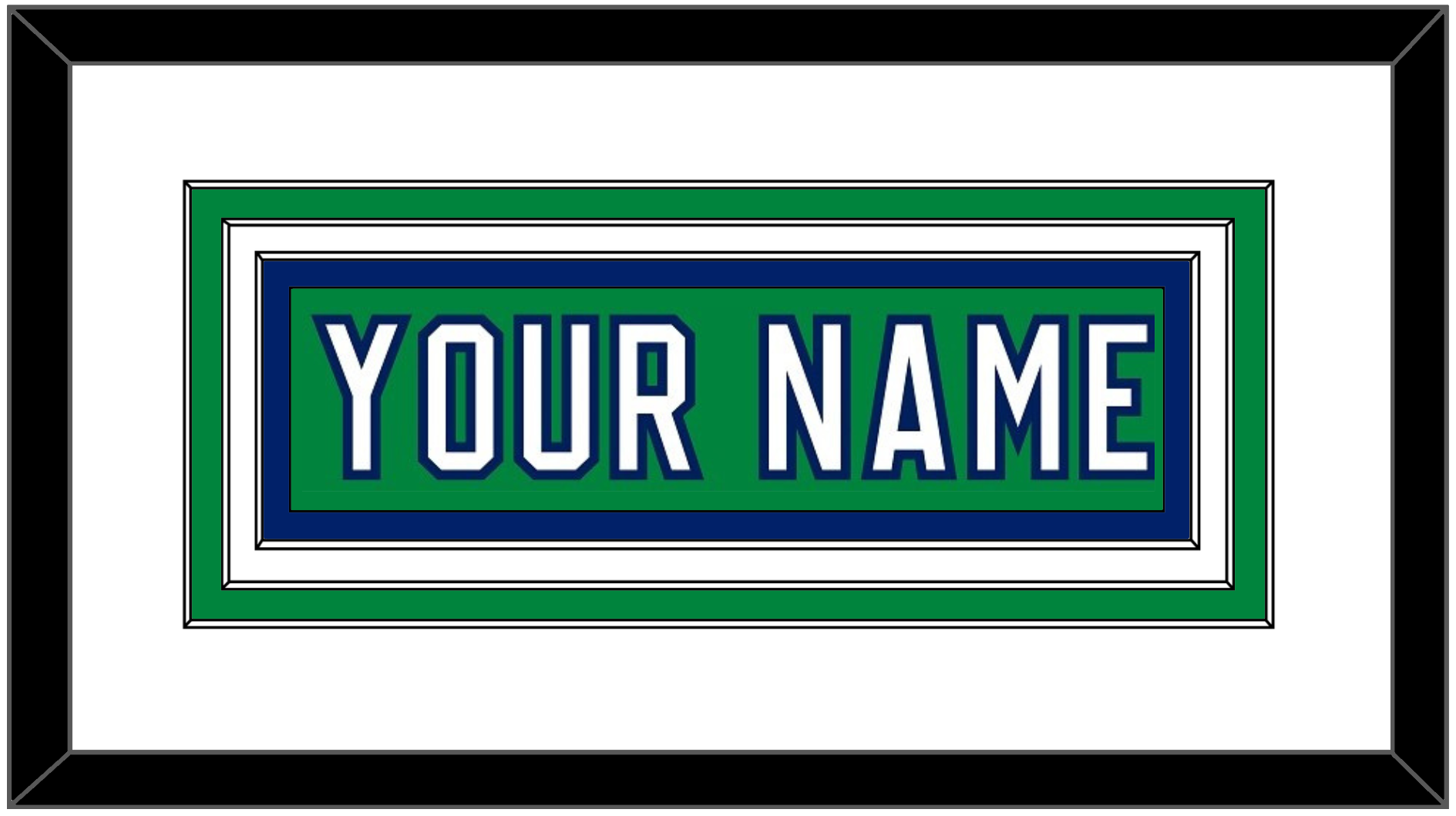 Carolina Heritage Green Jersey (2018 Through 2023) Nameplate. Triple Mat: White Mat Over A Green Mat Over A White Mat, Green Nameplate Mounted On Blue Mat. Black Frame.