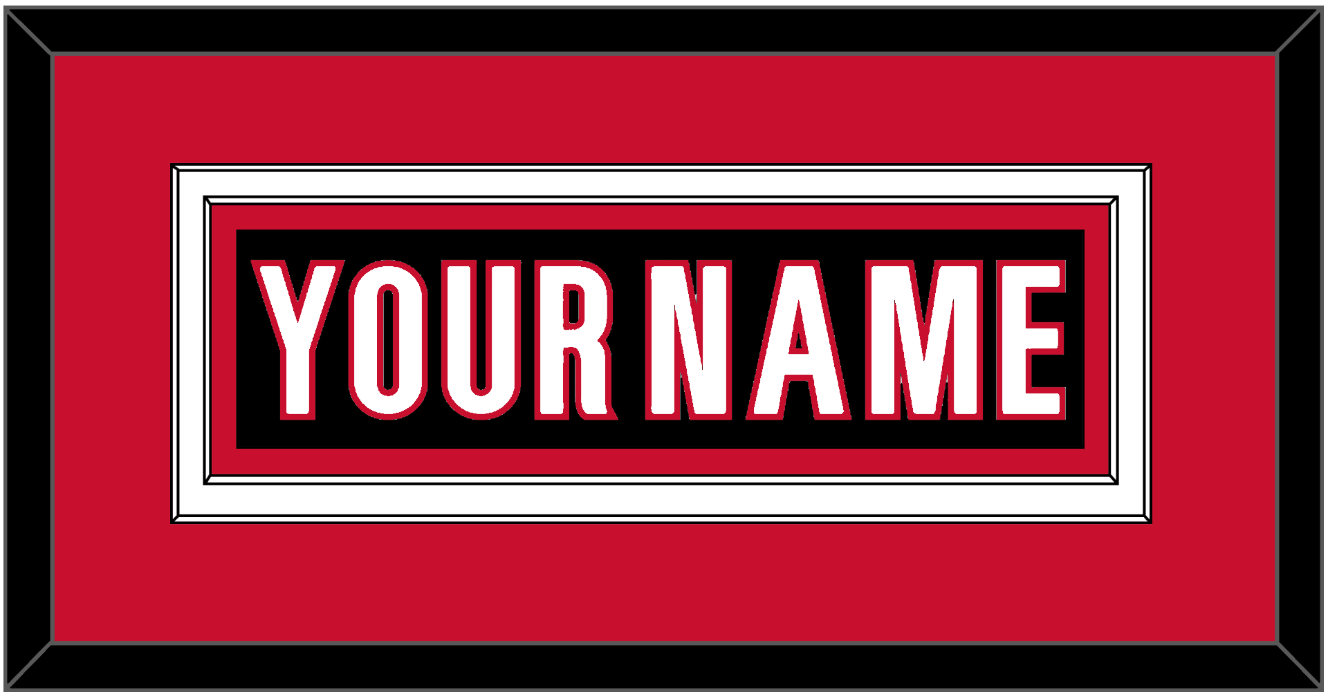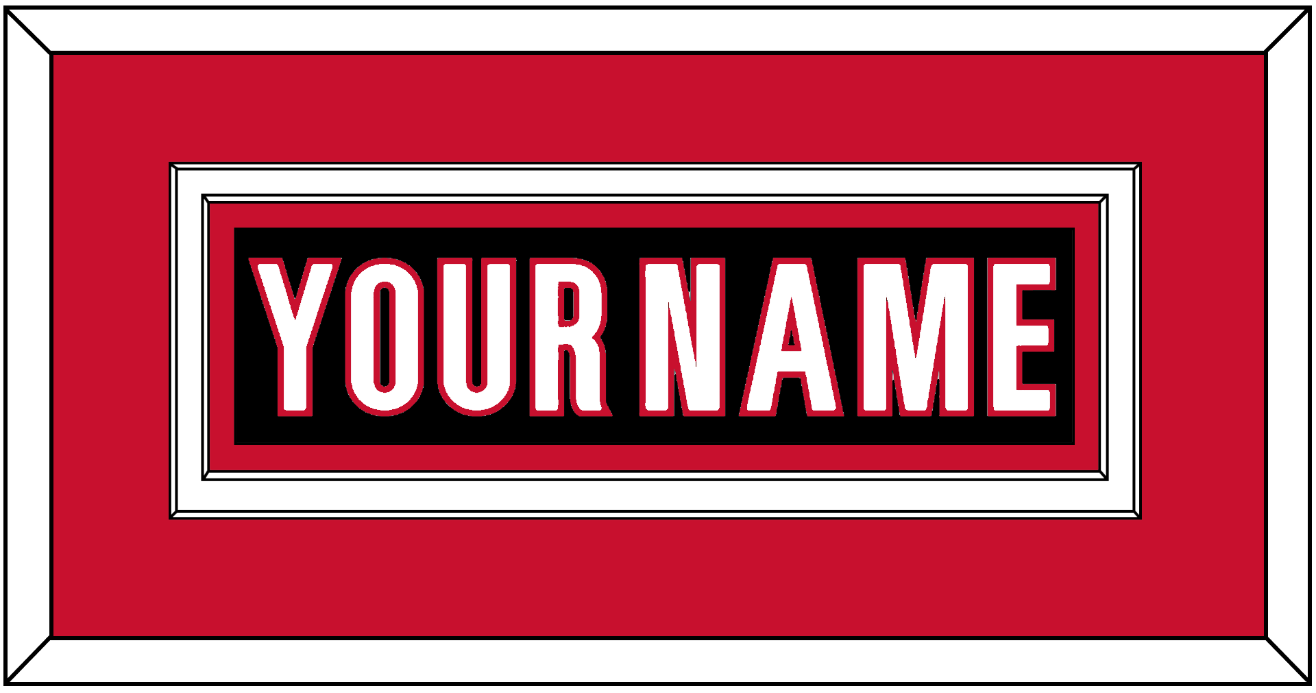 Carolina Home Black Jersey (2022 Through 2023) Nameplate.  Double Mat:  Red Mat Over White Mat, Black Nameplate Mounted On Red Mat.  Black Or White Frame.