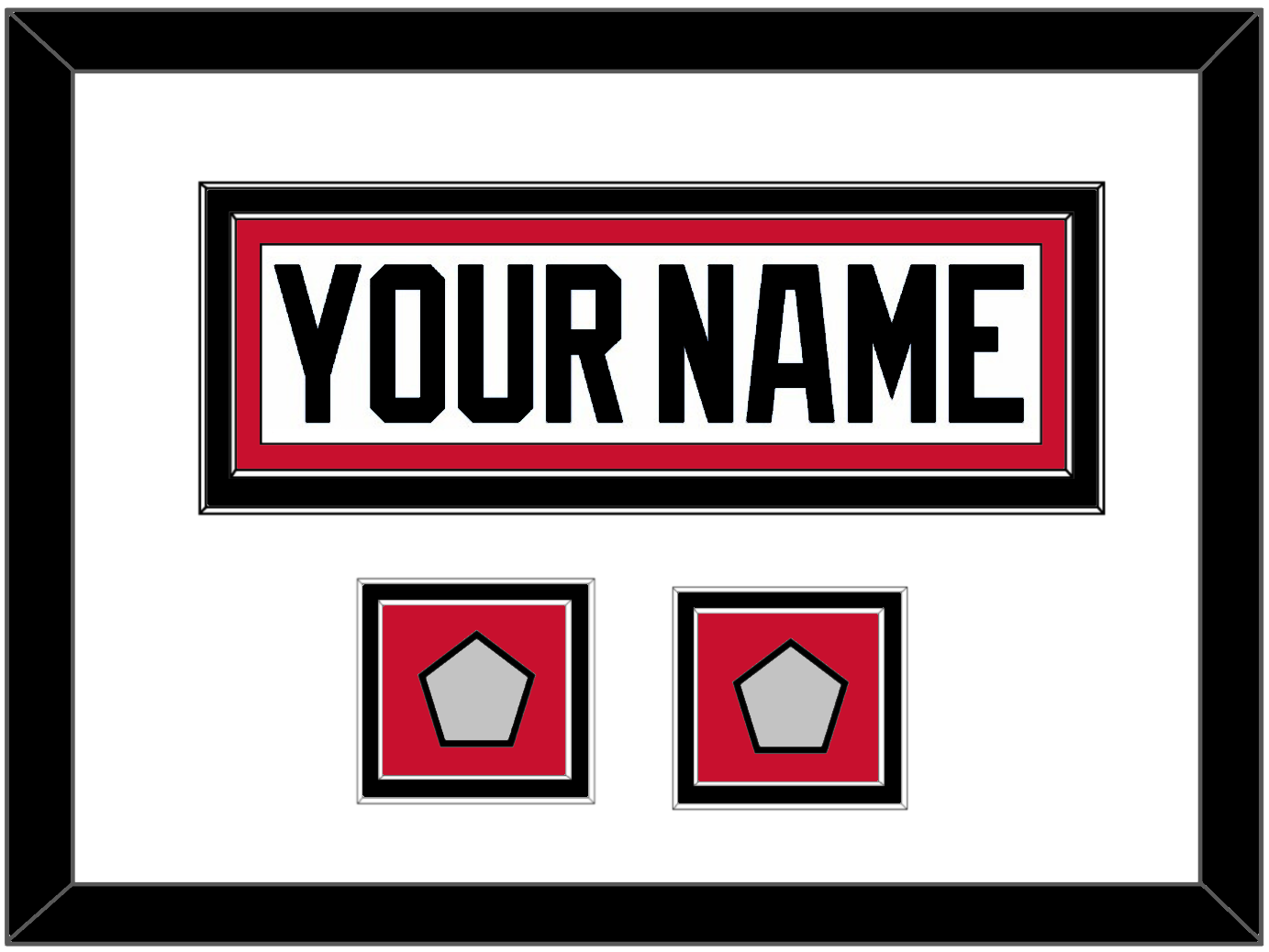 Chicago Road White Jersey (2007 Through 2017) Nameplate With 2010 & 2013 Or 2013 & 2015 Stanley Cup Champions Jersey Patches. Double Mat Cut: White Mat Over A Black Mat. White Nameplate & Patches Mounted On A Red Mat. Black Frame.