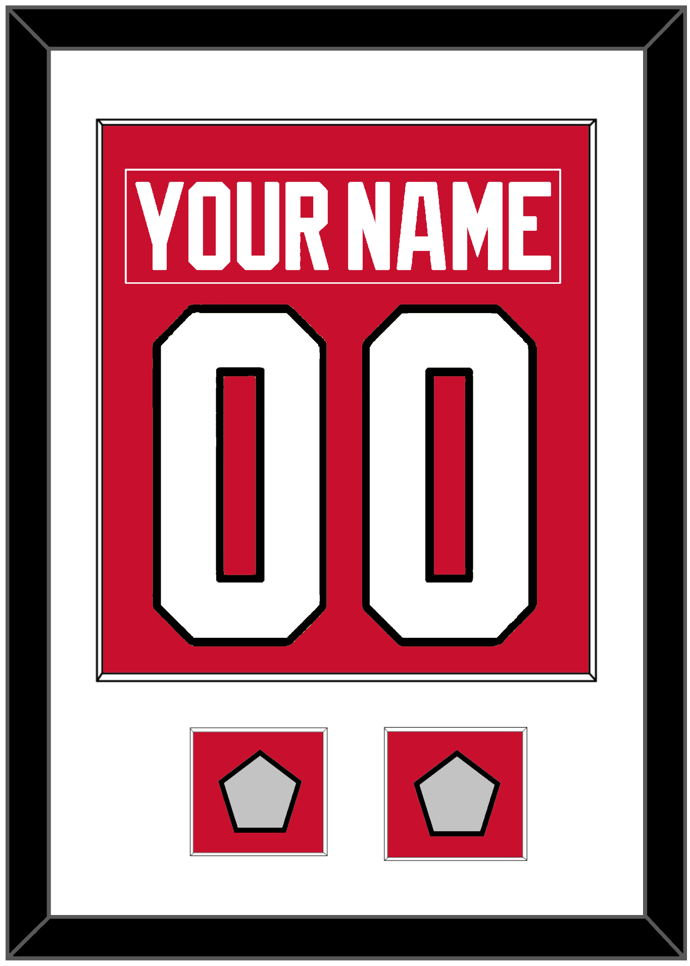Chicago Home Red Jersey (2007 Through 2017) Nameplate & Number (From The Back Of The Jersey) With 2010 & 2013 Or 2013 Or 2015 Stanley Cup Champions Patches.  Single Mat Cut:  White Mat With Red Nameplate, White Number & Patches Mounted On A Red Mat.  Black Frame.