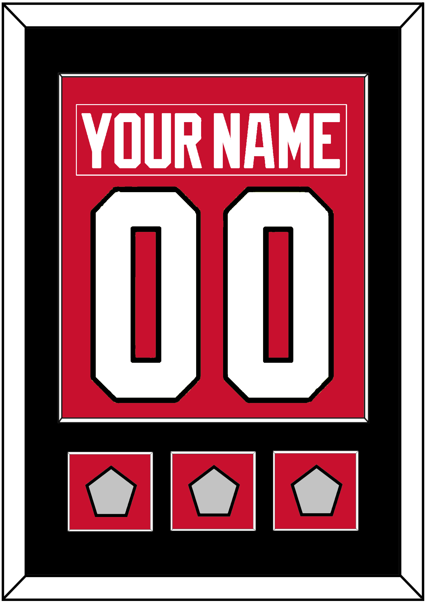 Chicago Home Red Jersey (2007 Through 2017) Nameplate & Number (From The Back Of The Jersey) With 2010, 2013 & 2015 Stanley Cup Champions Patches.  Single Mat Cut:  Black Mat With Red Nameplate, White Number & Patches Mounted On A Red Mat.  White Frame.
