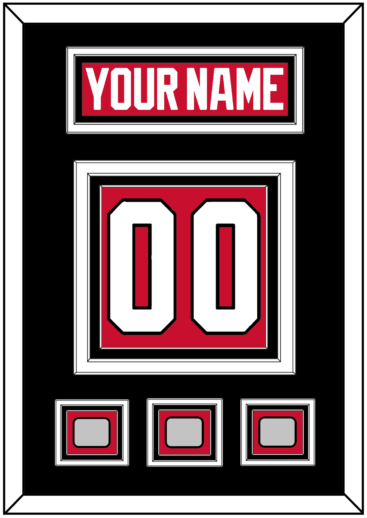 Chicago Home Red Jersey (2007 Through 2017) Nameplate & Numbers (From The Back Of The Jersey) With 2010, 2013 & 2015 Stanley Cup Finals Patches.  Nameplate Is Double Mat Cut:  Black Mat Over A White Mat.  Red Nameplate Mounted On A Black Mat.  To Match The Jersey, Number & Patches Are Triple Mat Cut:  Black Mat Over A White Mat Over A Black Mat. White Number & Patches Mounted On A Red Mat.  White Frame.