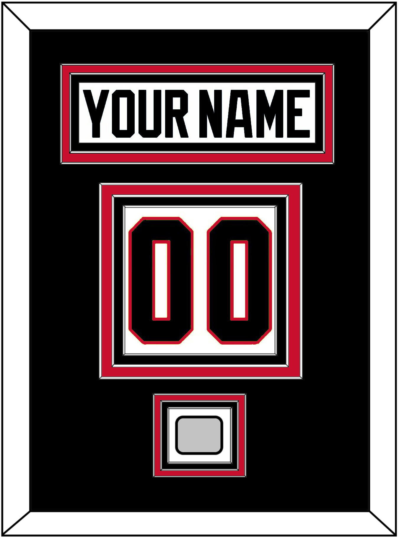 Chicago Road White Jersey (2007 Through 2017) Nameplate & Numbers (From The Back Of The Jersey) With 2010, 2013 Or 2015 Stanely Cup Finals Patch.  Nameplate Is Double Mat Cut:  Black Mat Over A Red Mat.  White Nameplate Mounted On A Black Mat.  To Match The Jersey, Number & Patch Are Triple Mat Cut:  Black Mat Over A Red Mat Over A Black Mat, Black Number & Patch Mounted On A White Mat.  White Frame.