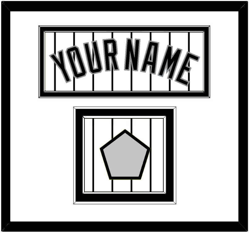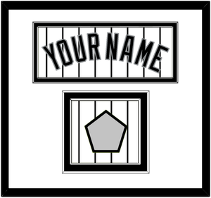 Chicago Home White Pinstripes Jersey Name With 2005 World Series Jersey Patch. Double Mat Cut: White Mat Over A Black Mat. Black Name & Patch Mounted On Pinstripe Background. Black Frame.