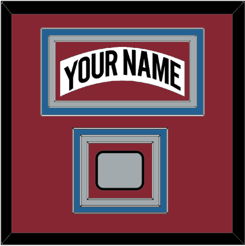 Colorado Home White Jersey (1995 Through 1996) Nameplate With 1996 Or 2001 Stanley Cup Finals Patch. Triple Mat Cut: Burgundy Mat Over A Blue Mat Over A Gray Mat, With White Nameplate & Patch Mounted On A Burgundy Mat. White, Black Or Silver (Metal) Frame.