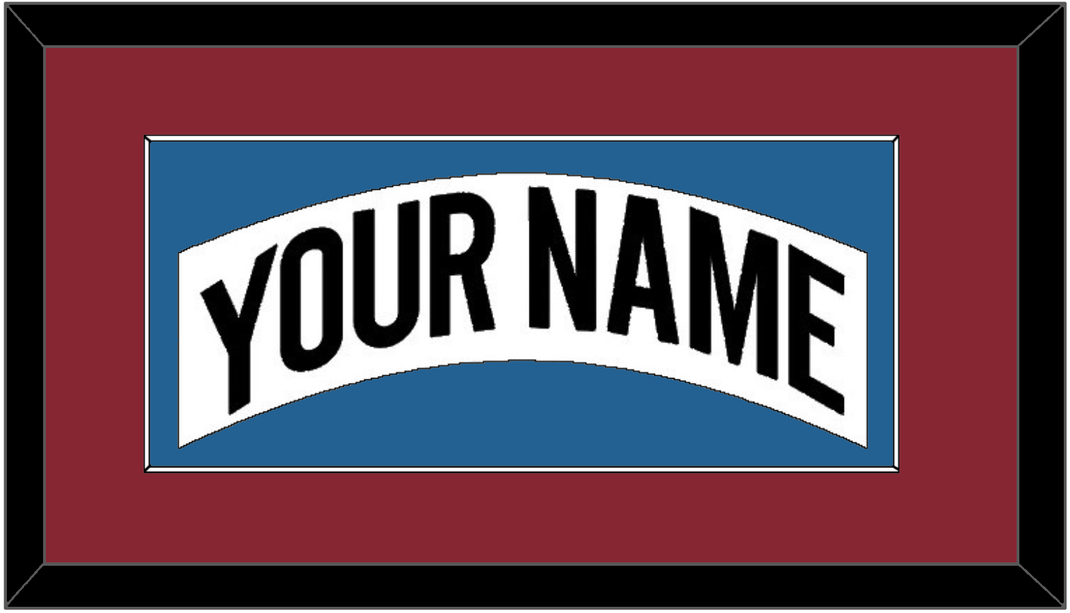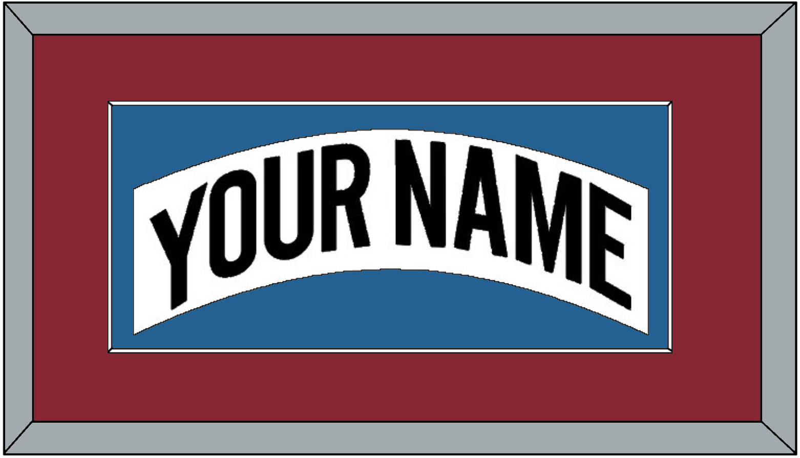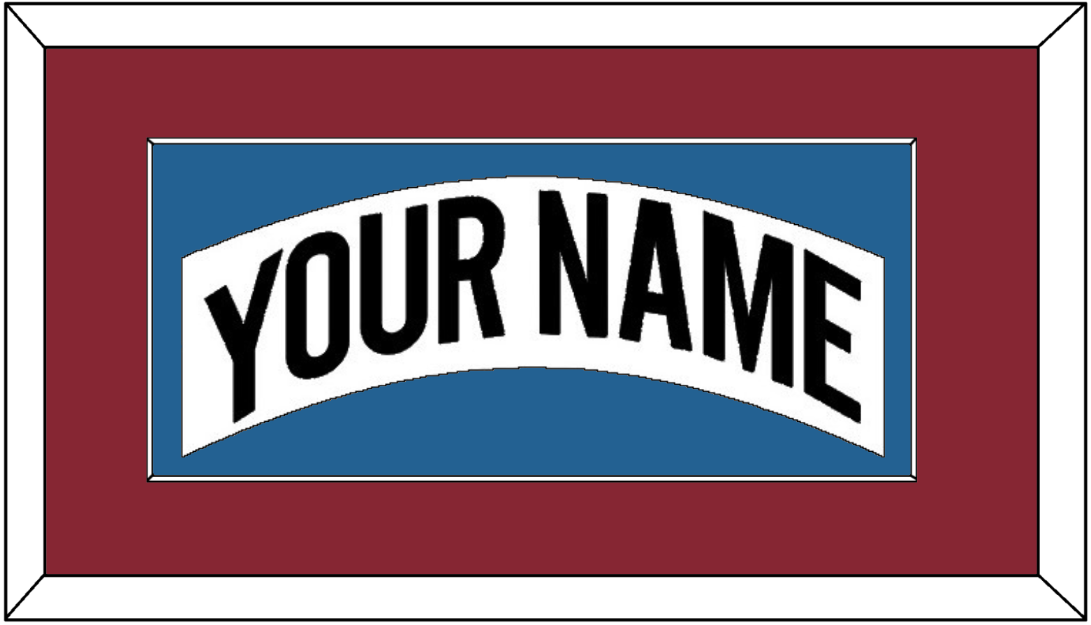 Colorado Home White Jersey (1995 Through 1996) Nameplate.  Single Mat:  Burgundy Mat, White Nameplate Mounted On Blue Mat.  White, Black Or Silver (Metal) Frame.