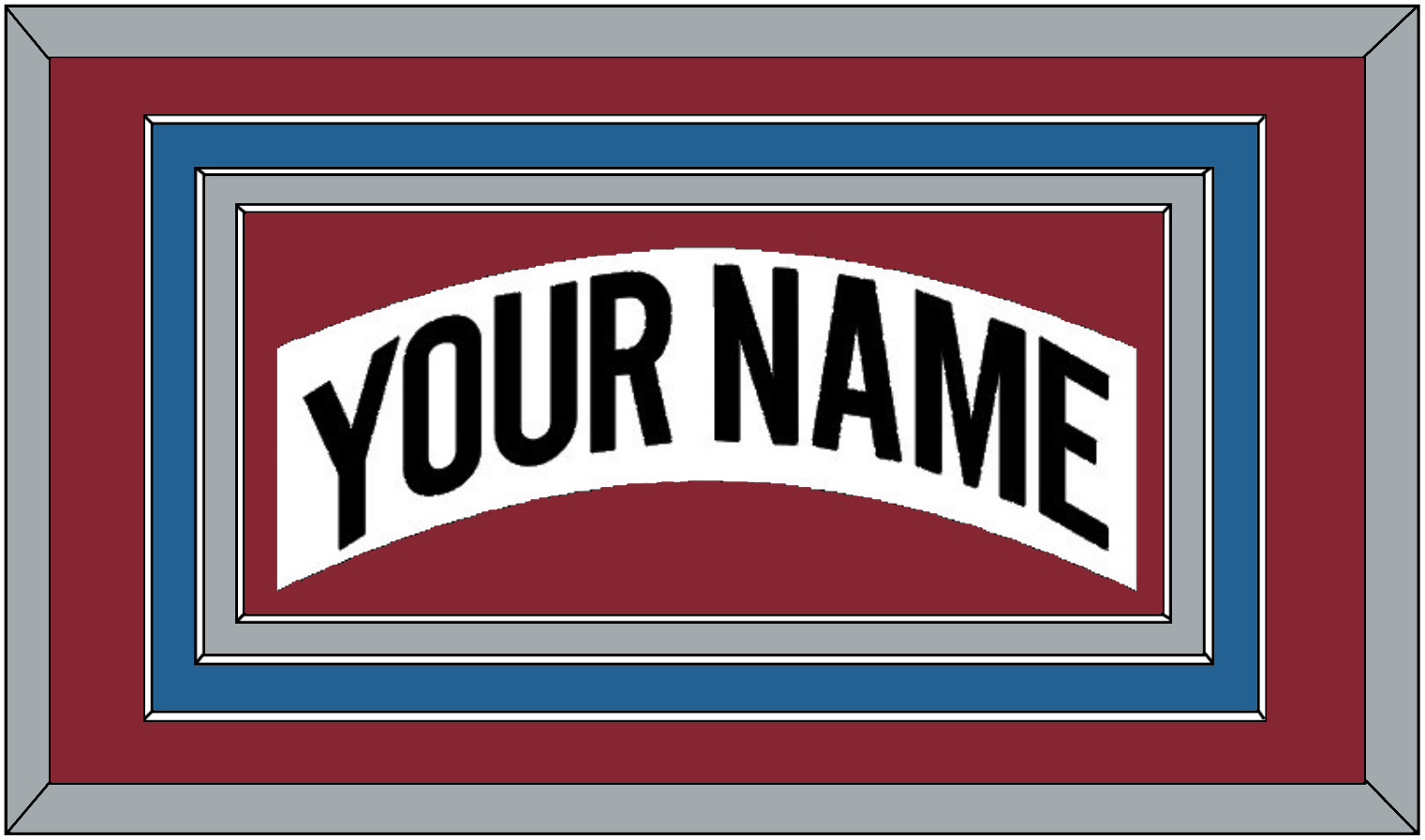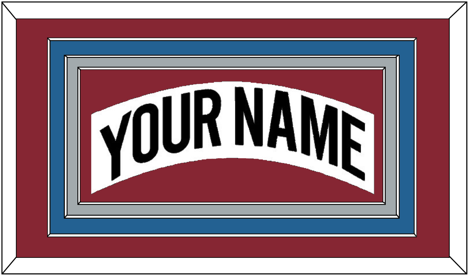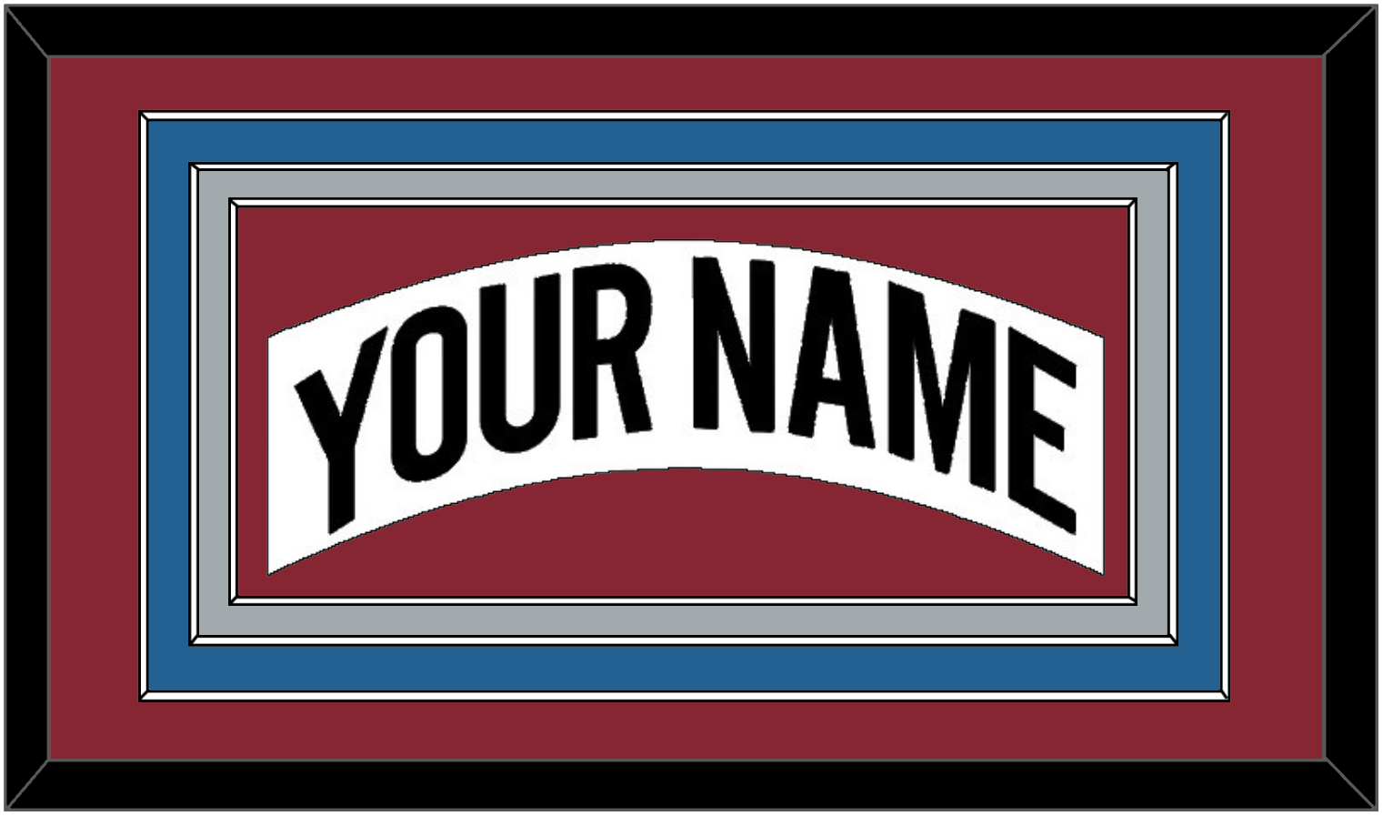 Colorado Home White Jersey (1995 Through 1996) Nameplate.  Triple Mat:  Burgundy Mat Over A Blue Mat Over A Gray Mat. White Nameplate Mounted On Burgundy Mat.  White, Black Or Silver (Metal) Frame.