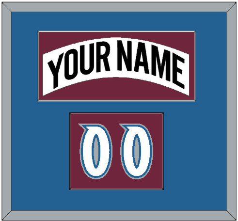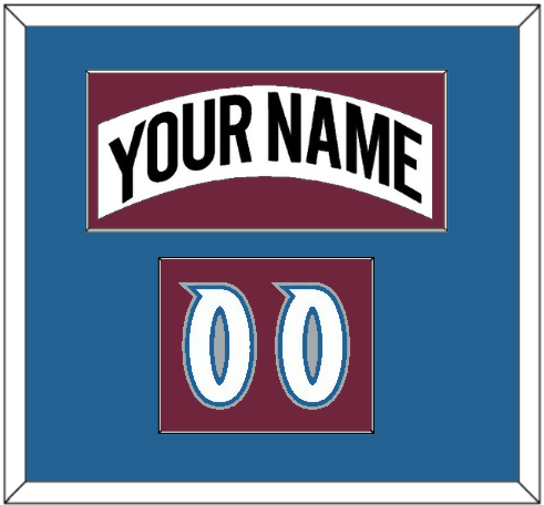 Colorado Home White Jersey (1999 Through 2001) Nameplate & Numbers From Shoulder - Blue Mat With White Nameplate & White Numbers Mounted On A Burgundy Mat. White, Black Or Silver (Metal) Frame.