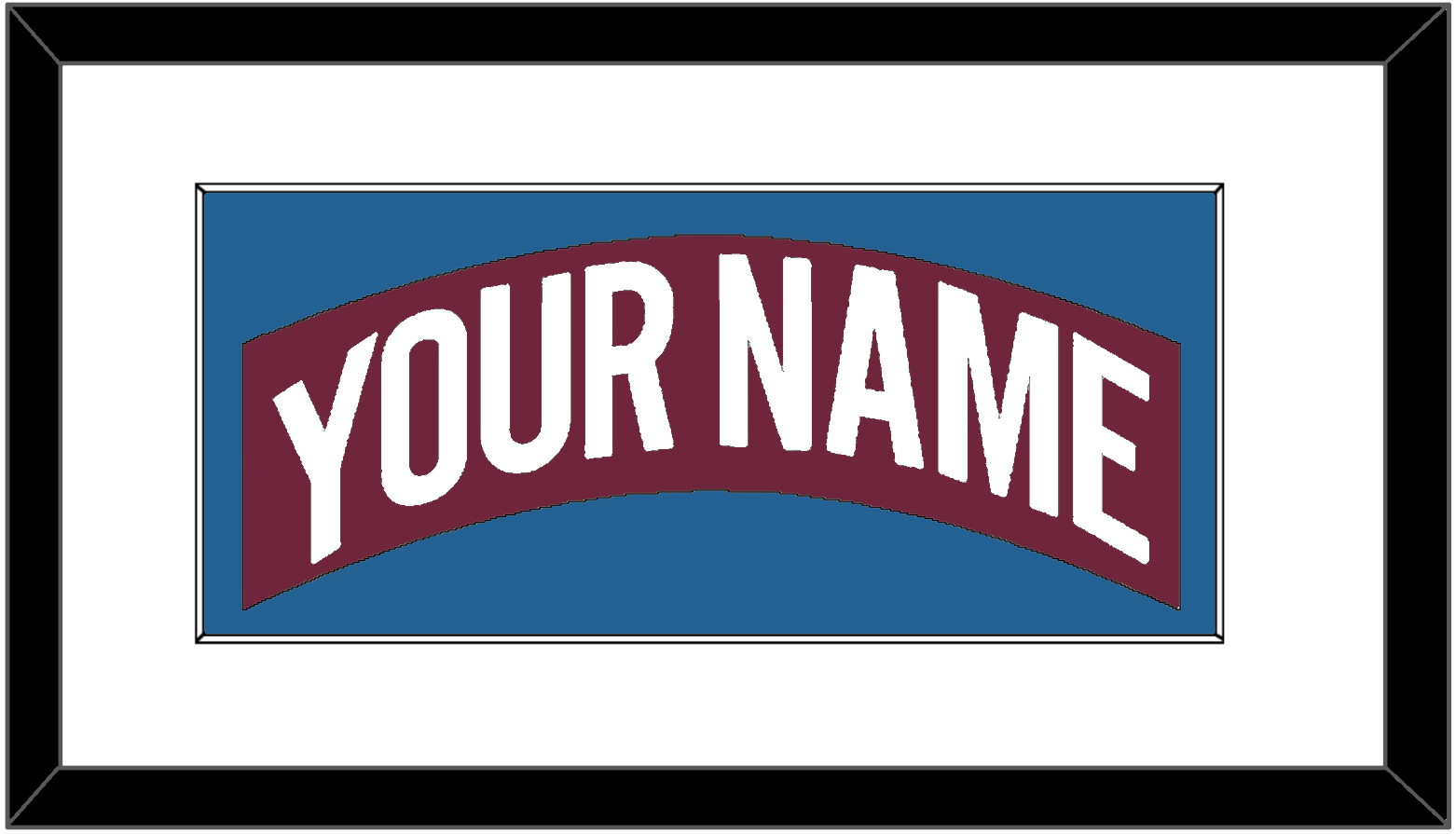 Colorado Road Burgundy Jersey (1999 Through 2001) Nameplate.  Single Mat:  White Mat, Burgundy Nameplate Mounted On Blue Mat.  Black Frame.