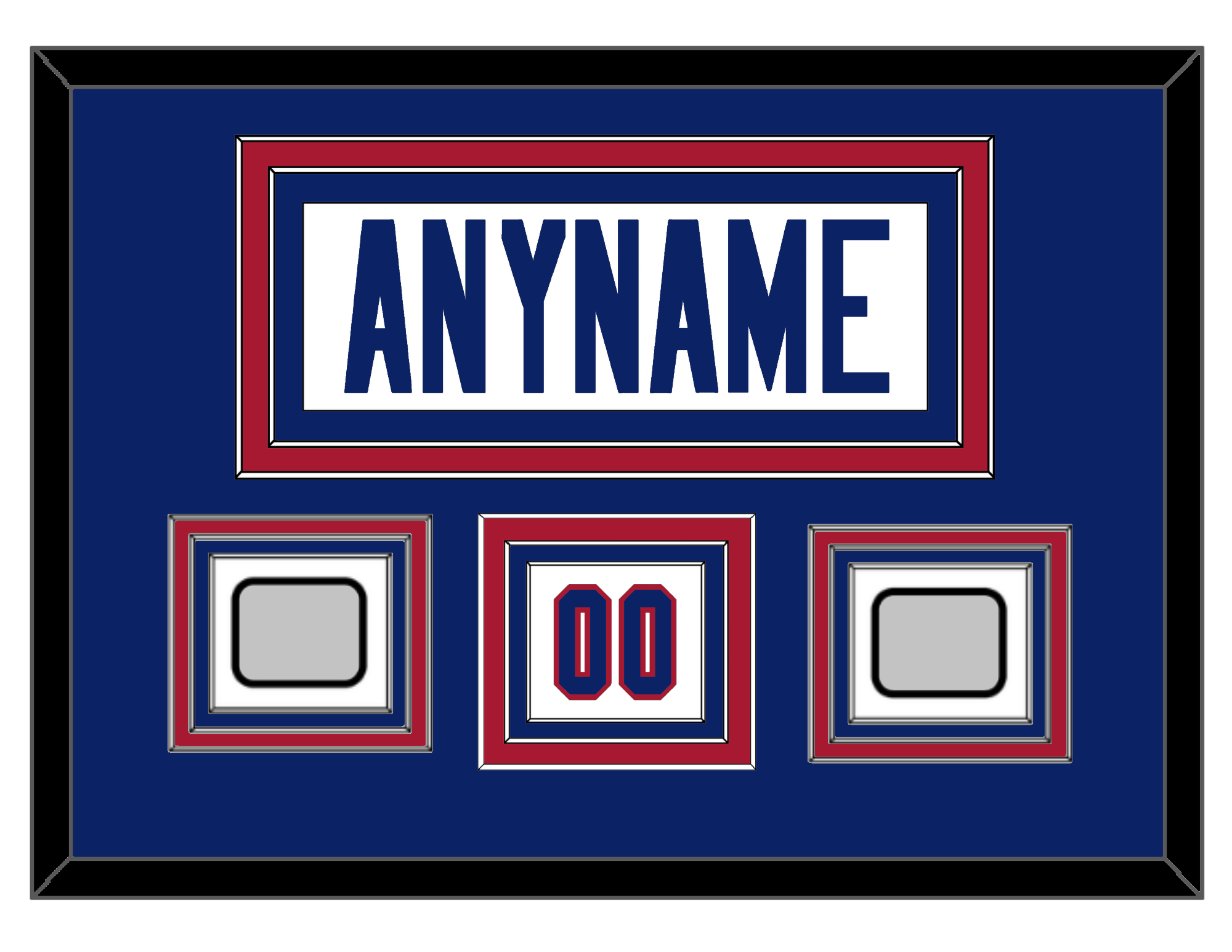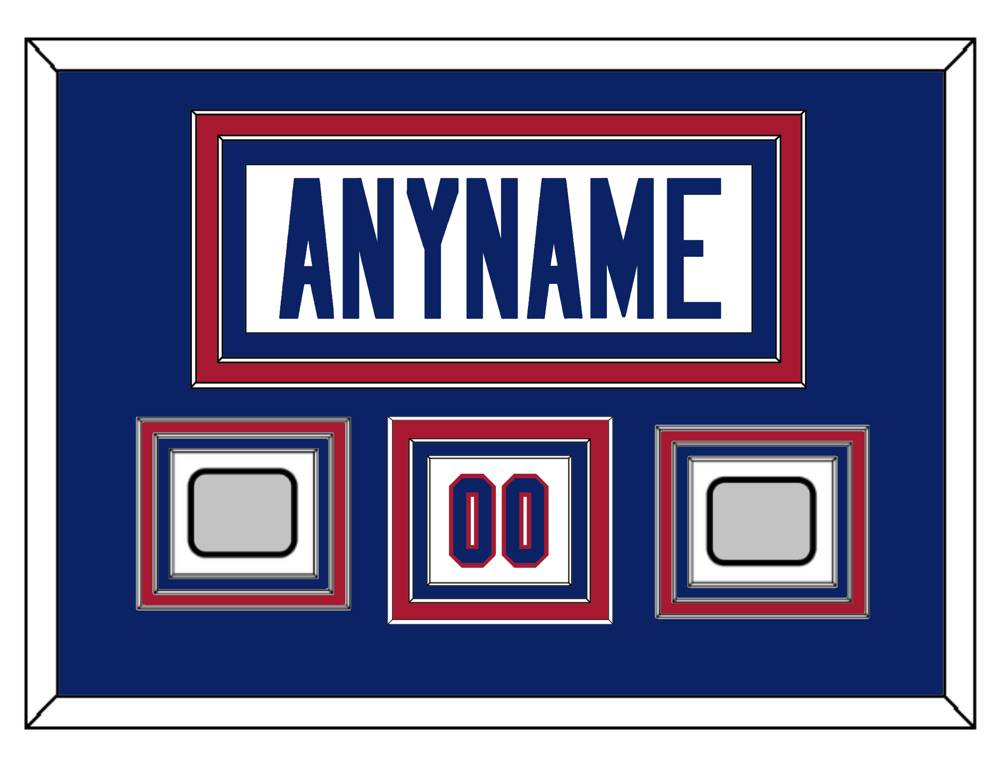 New York Road White Jersey (1980 Through 1988) Nameplate, Number(s) From Shoulder, XXI & XXV Super Bowl Jersey Patches.  The Nameplate Is Double Mat Cut:  Blue Mat Over A Red Mat, White Nameplate Mounted On A Blue Mat.  To Match The Jersey, The Numbers & Patches Are Triple Mat Cut:  Blue Mat Over A Red Mat Over A Blue Mat, Blue Numbers & Patches Mounted On A White Mat.  White Or Black Frame.