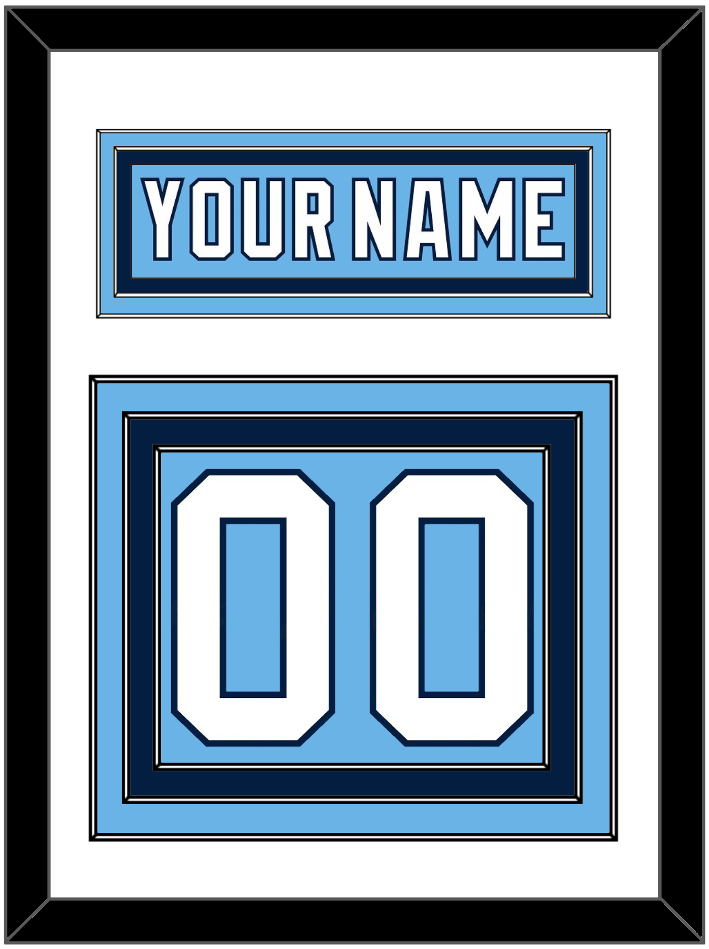 Pittsburgh 2008 Winter Classic Powder Blue Jersey Nameplate & Numbers (From The Back Of The Jersey). Nameplate Is Double Mat Cut: White Mat Over A Powder Blue Mat. Powder Blue Nameplate Mounted On A Navy Blue Mat. To Match The Jersey, Number Is Triple Mat Cut: White Mat Over A Powder Blue Mat Over A Navy Blue Mat, White Number Mounted On A Powder Blue Mat. Black Frame.