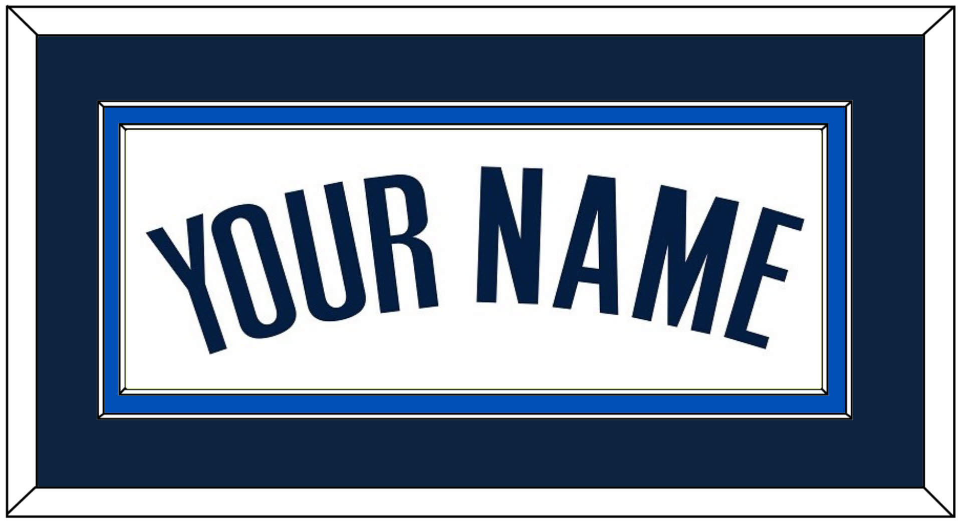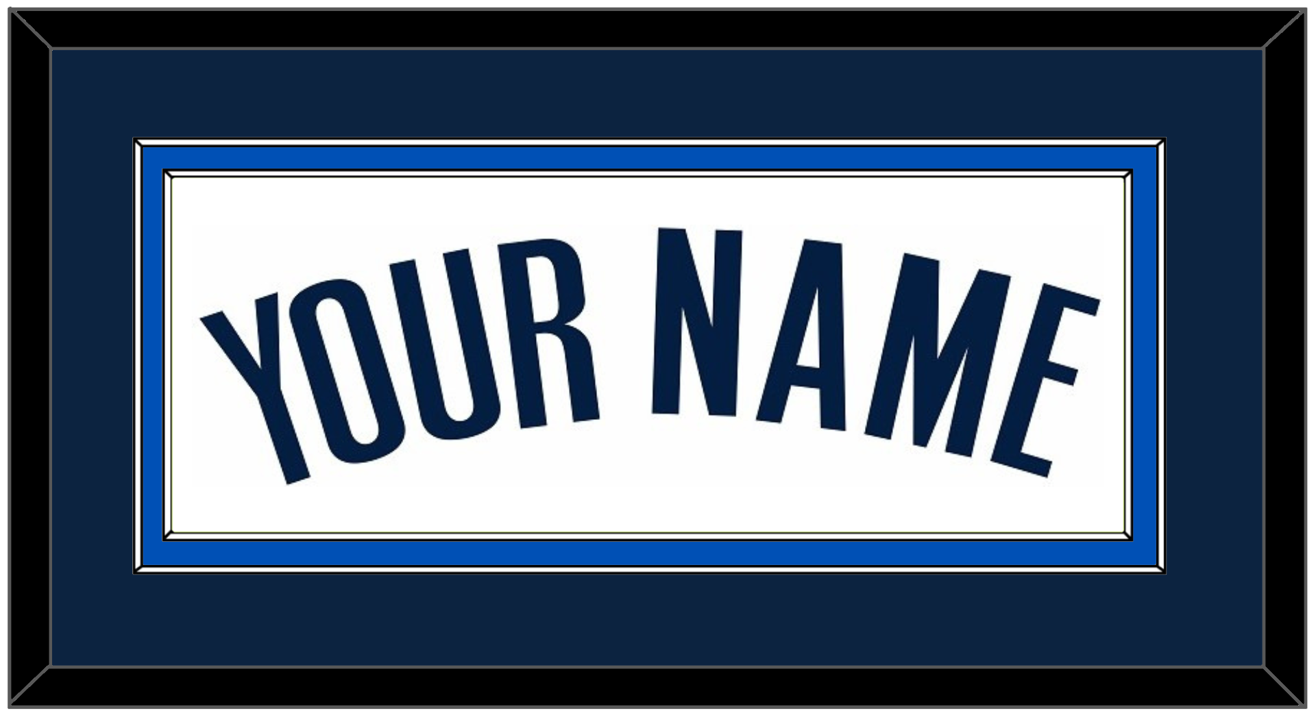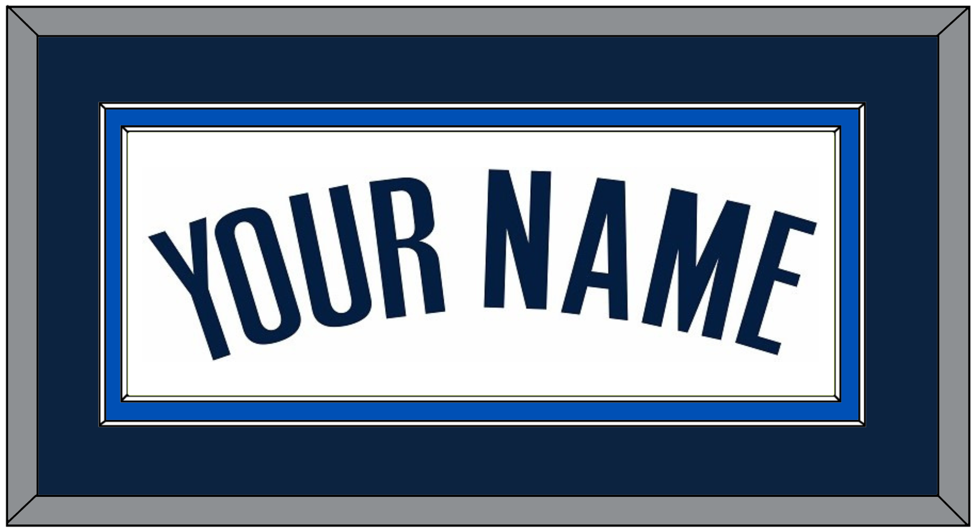Dallas White Association Jersey Name. Double Mat: Navy Blue Mat Over A Blue Mat, Navy Blue Name Mounted On White Mat. White, Black Or Silver (Metal) Frame.