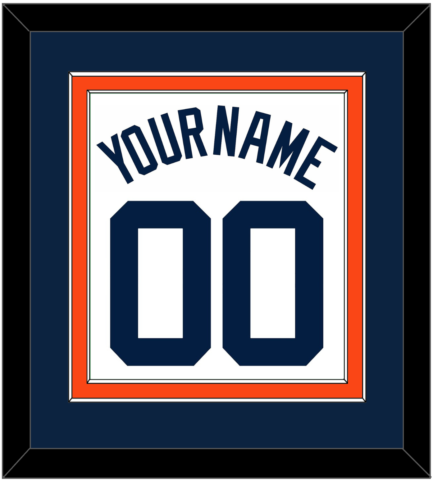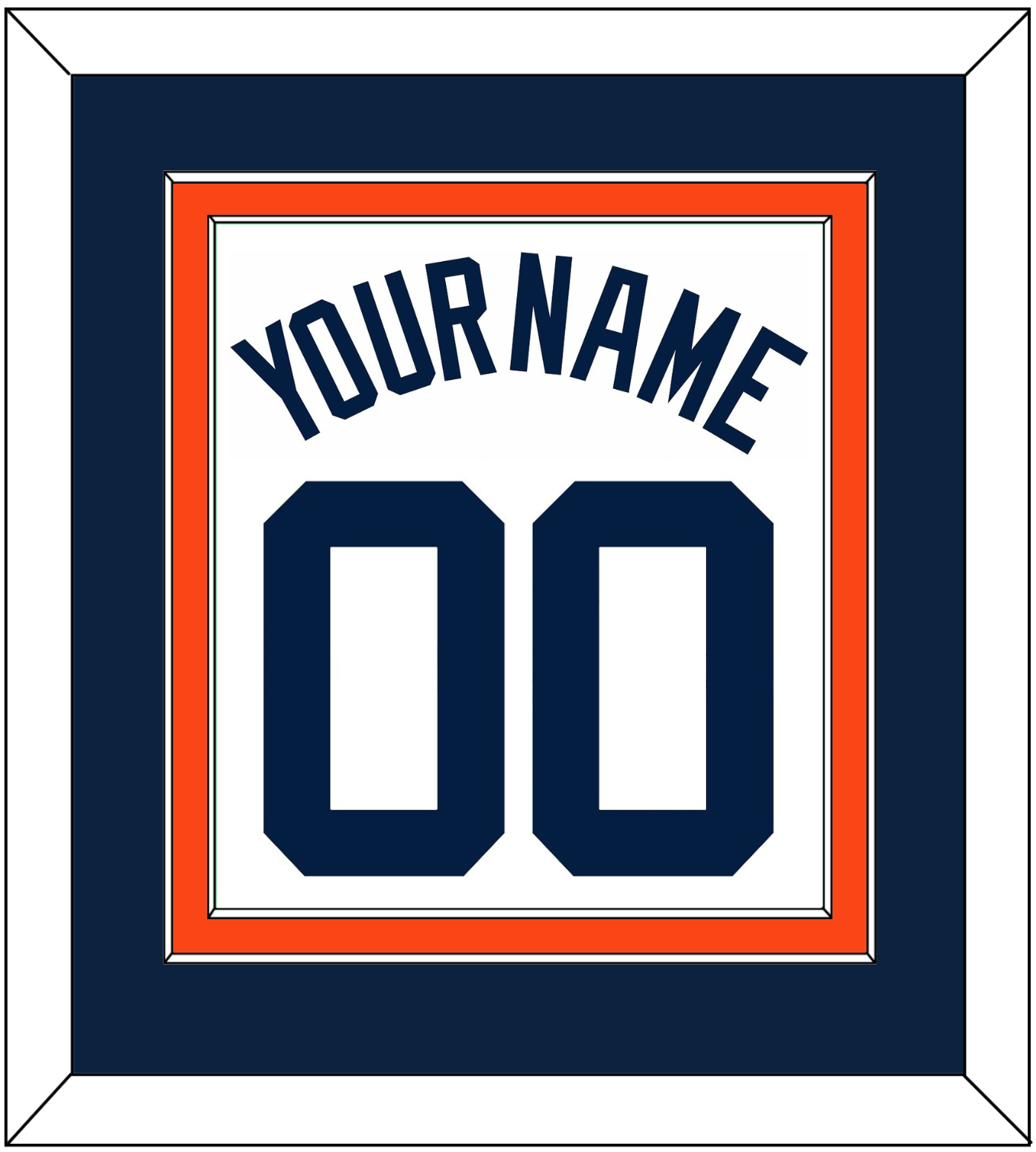 Detroit Home White Jersey (1972 Through 2017) Name & Number. Double Mat: Blue Mat Over An Orange Mat. Name And Number Mounted On White Mat. Black Frame.