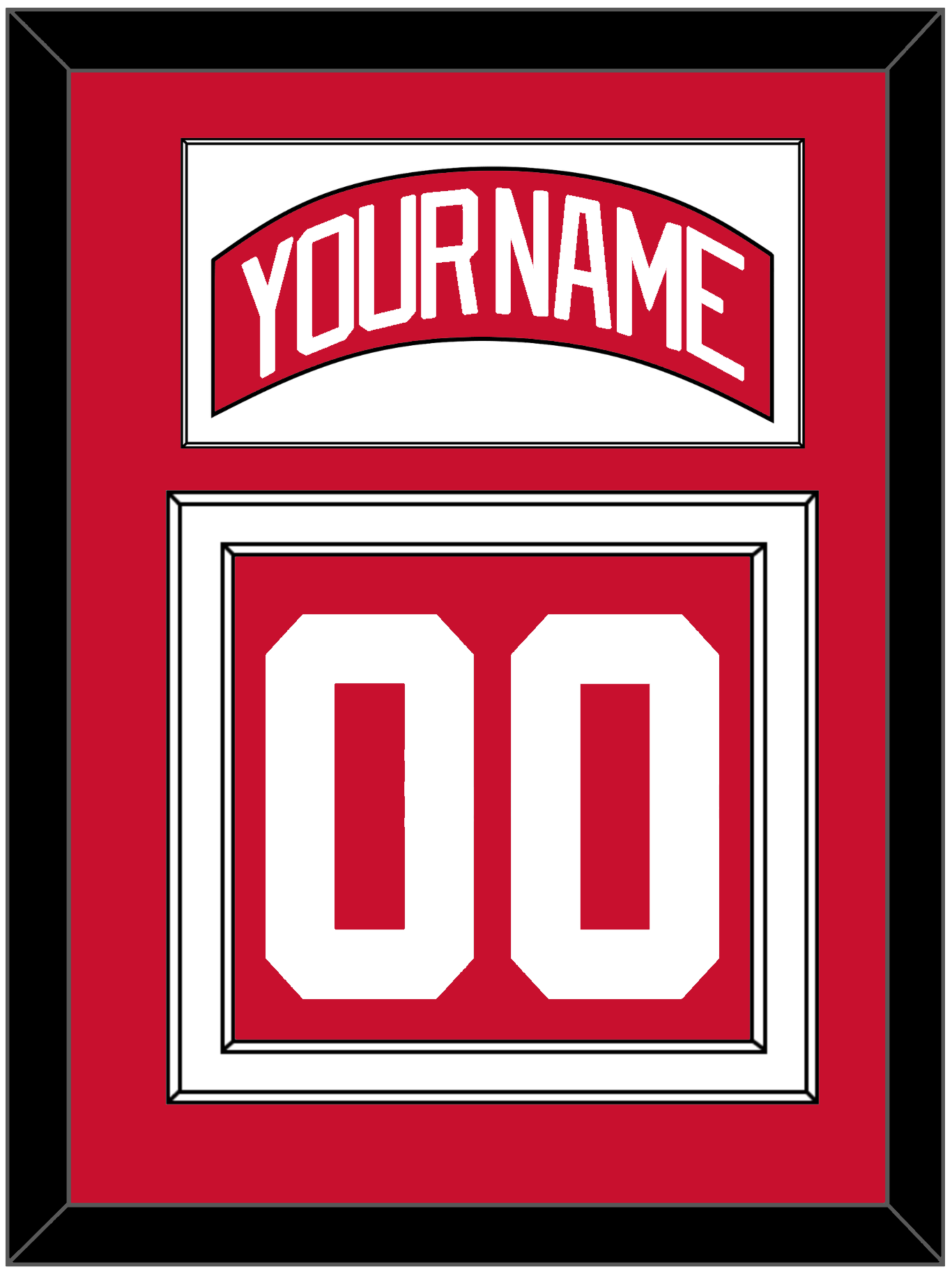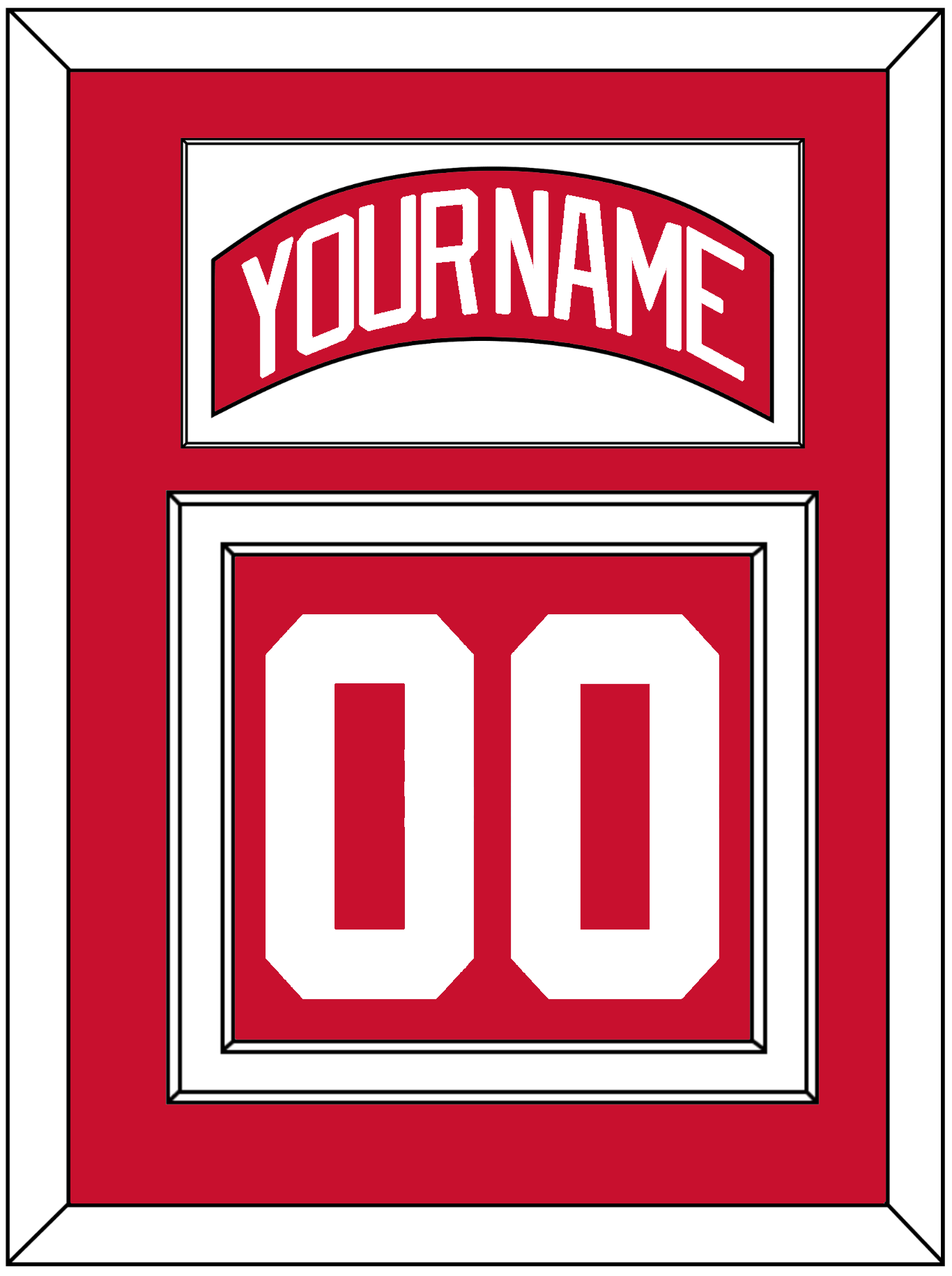 Detroit Road Red Jersey (1987 Through 2007) Nameplate & Numbers (From The Back Of The Jersey). Nameplate Is Single Mat Cut: Red Mat With Red Nameplate Mounted On A White Mat. To Match The Jersey, Number Is Double Mat Cut: Red Mat Over A White Mat, White Number Mounted On A Red Mat. White Or Black Frame.