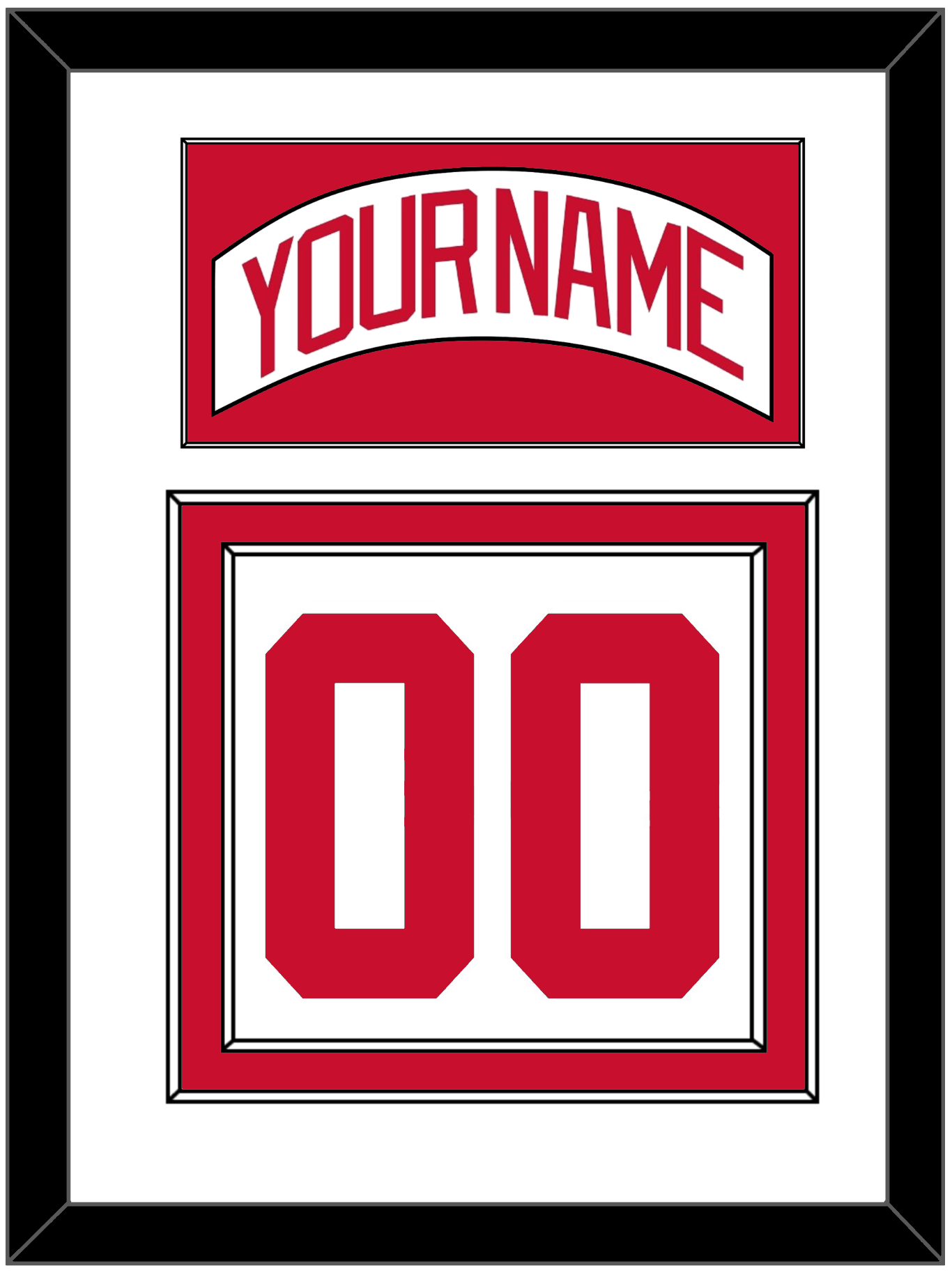 Detroit Road White Jersey (2007 Through 2017) Nameplate & Numbers (From The Back Of The Jersey). Nameplate Is Single Mat Cut: White Mat With White Nameplate Mounted On A Red Mat. To Match The Jersey, Number Is Double Mat Cut: White Mat Over A Red Mat, Red Number Mounted On A White Mat. Black Frame.