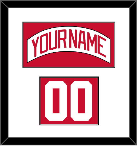 Detroit Road White Jersey (2007 Through 2017) Nameplate & Numbers From Shoulder - White Mat With The White Nameplate & White Numbers Mounted On Red Mat. Black Frame.