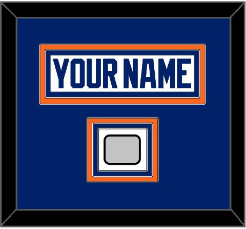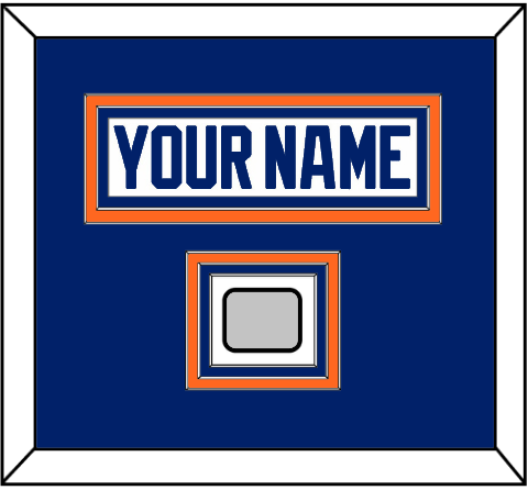 Edmonton Home White Jersey (1981 Through 1994) Nameplate With 1990 Stanley Cup Finals Patch. Nameplate Is Double Mat Cut: Blue Mat Over An Orange Mat. White Nameplate Mounted On An Orange Mat. To March The Jersey, The Patch Is Triple Mat Cut: Blue Mat Over An Orange Mat Over A Blue Mat, With Patch Mounted On A White Mat. White Or Black Frame.