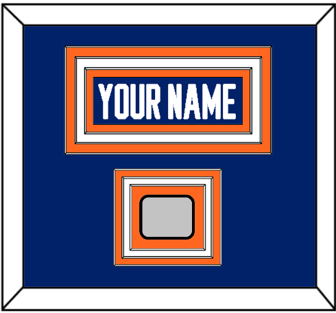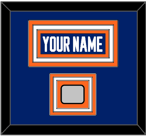 Edmonton Road Blue Jersey (1981 Through 1994) Nameplate With 1990 Stanley Cup Finals Patch.  Triple Mat Cut:  Blue Mat Over An Orange Mat Over A White Mat, With Blue Nameplate & Patch Mounted On An Orange Mat.  White Or Black Frame.