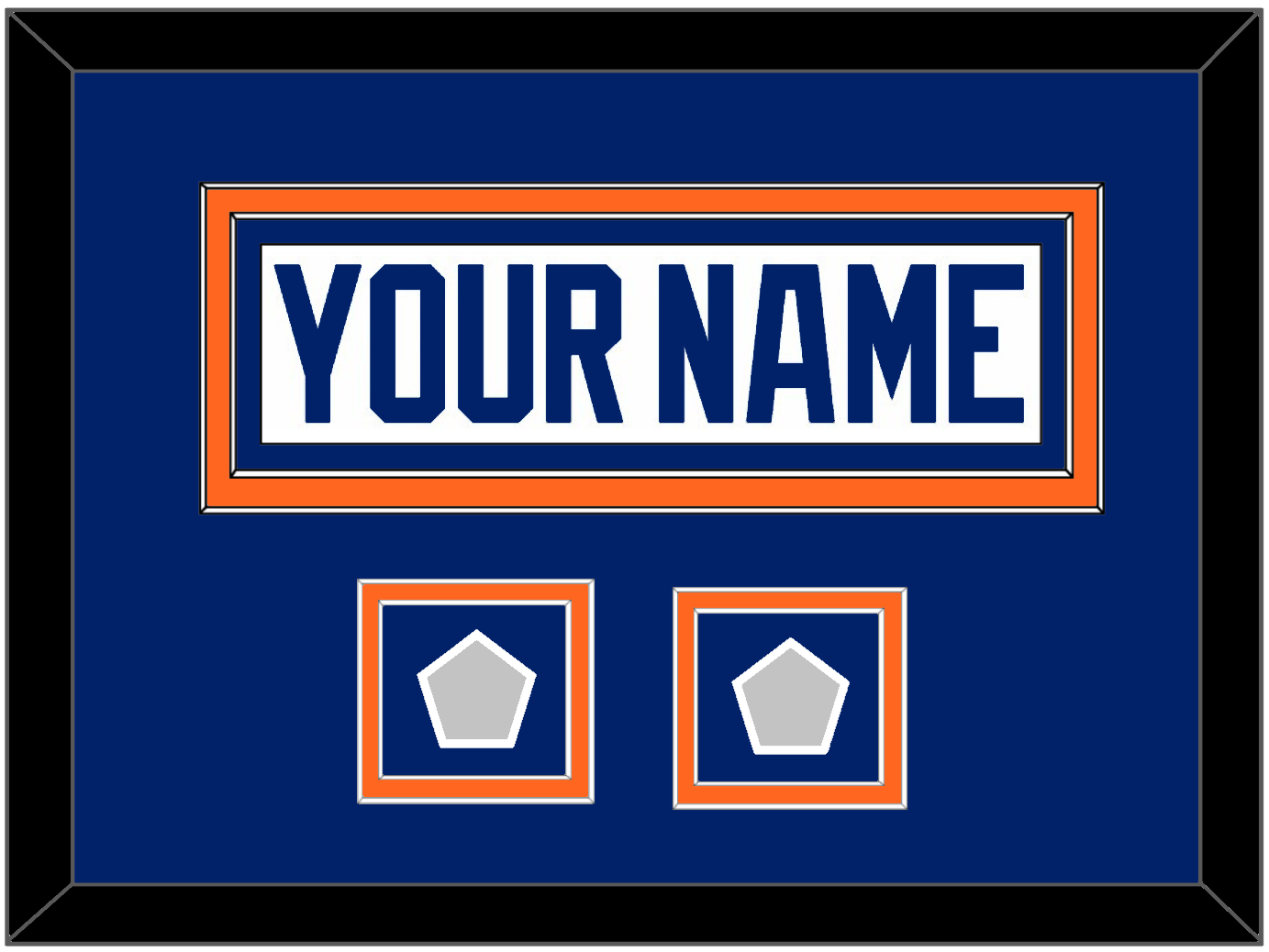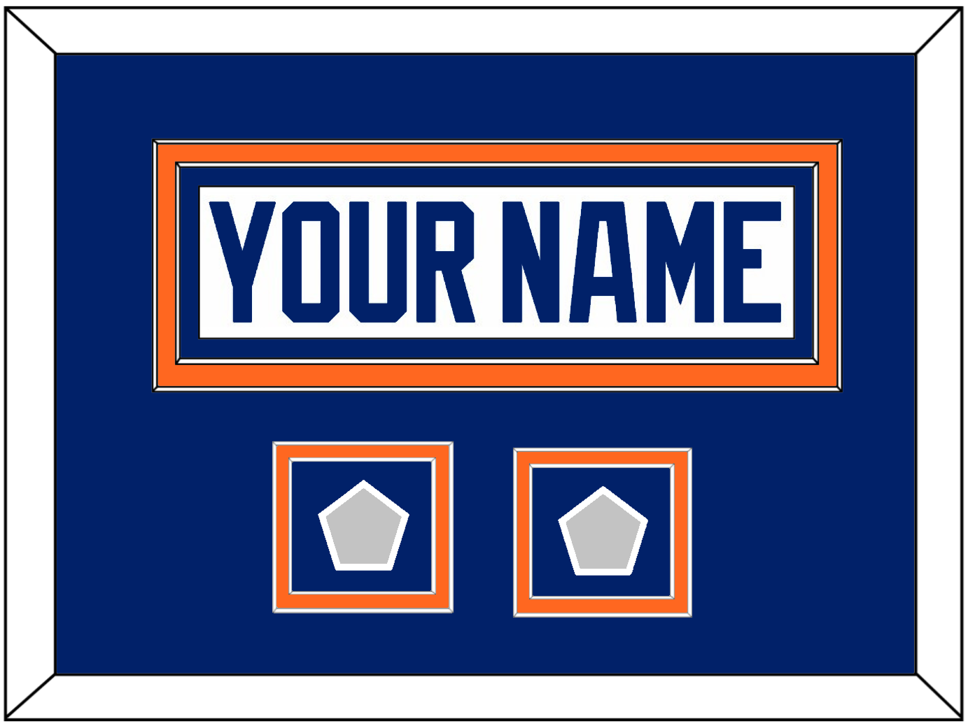 Edmonton Home White Jersey (1981 Through 1994) Nameplate With 2 Stanley Cup Champions Patches (1984 & 1985, 1985 & 1987, 1987 & 1988, Or 1988 & 1990) Double Mat Cut: Blue Mat Over An Orange Mat With White Nameplate & Patches Mounted On A Blue Mat. White Or Black Frame.