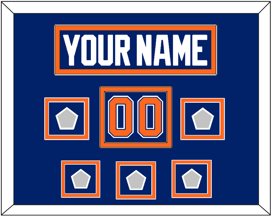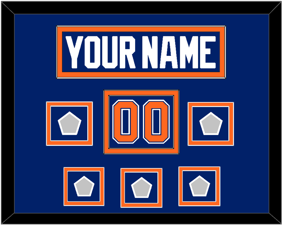 Edmonton Road Blue Jersey (1981 Through 1994) Nameplate, Numbers From Shoulder, & 5 Stanley Cup Champions Patches (1984, 1985, 1987, 1988 & 1990). The Nameplate Is Single Mat Cut: Blue Nameplate Mounted On An Orange Mat. To Match The Jersey, The Numbers & Patches Are Double Mat Cut: Blue Mat Over An Orange Mat. White Number & Patches Mounted On A Blue Mat. White Or Black Frame.