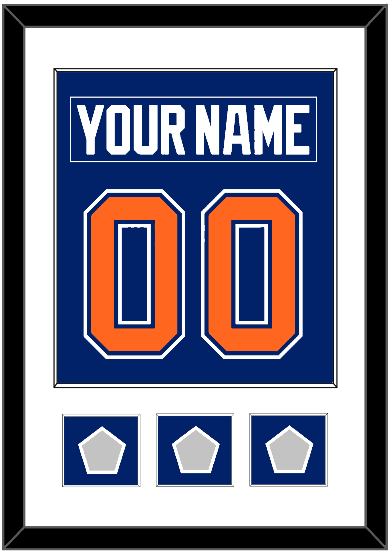 Edmonton Road Blue Jersey (1981 Through 1994) Nameplate & Number (From The Back Of The Jersey) With 1984, 1985,  & 1987; 1985, 1987 & 1988; Or 1987, 1988 & 1990 Stanley Cup Champions Patches.  Single Mat Cut:  White Mat With Blue Nameplate, Orange Number & Patches Mounted On A Blue Mat.  Black Frame.