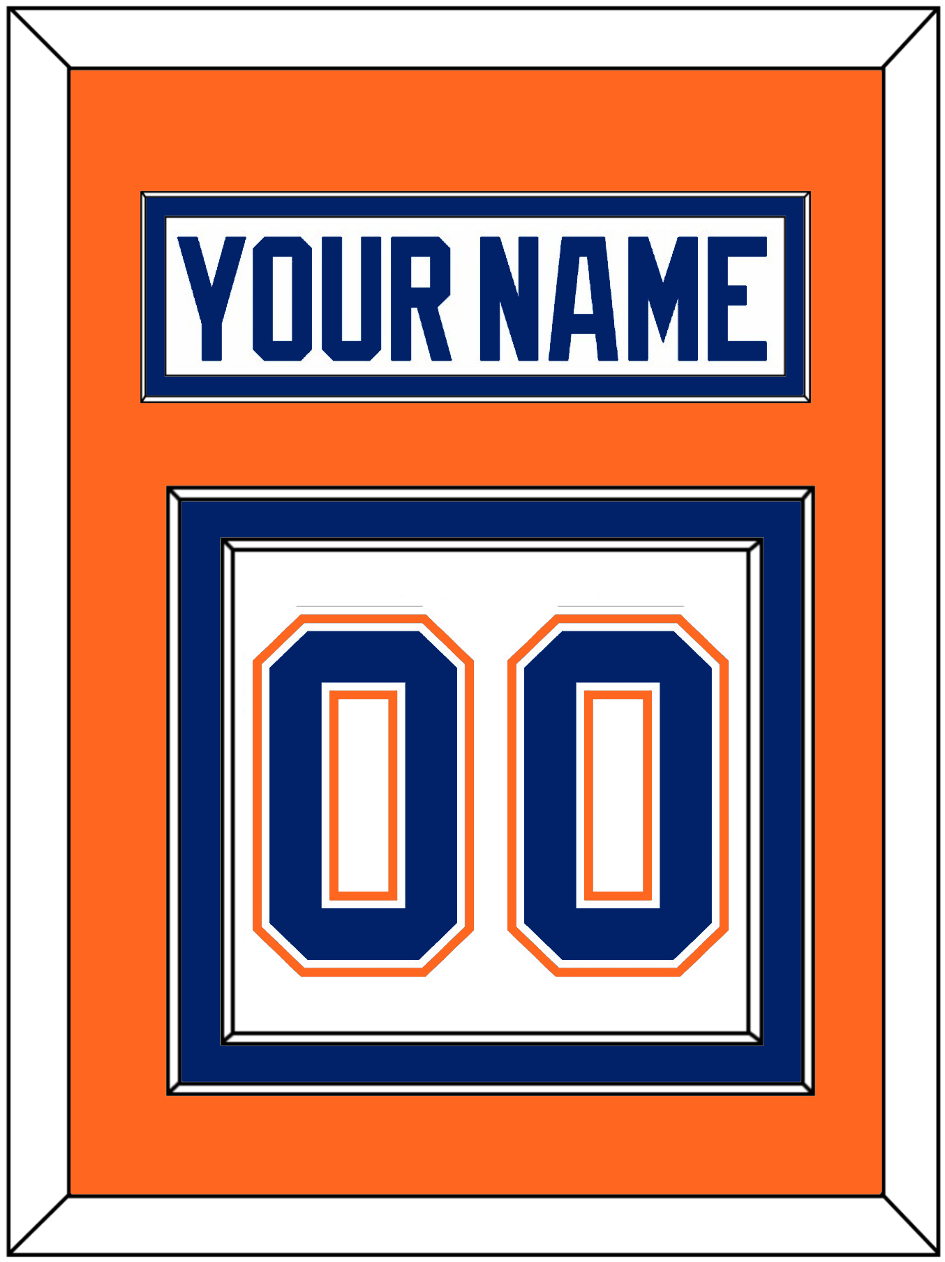 Edmonton Home White Jersey (1981 Through 1994) Nameplate & Numbers (From The Back Of The Jersey). Nameplate Is Single Mat Cut: Orange Mat With White Nameplate Mounted On A Blue Mat. To Match The Jersey, Number Is Double Mat Cut: Orange Mat Over A Blue Mat, Blue Number Mounted On A White Mat. White Or Black Frame.