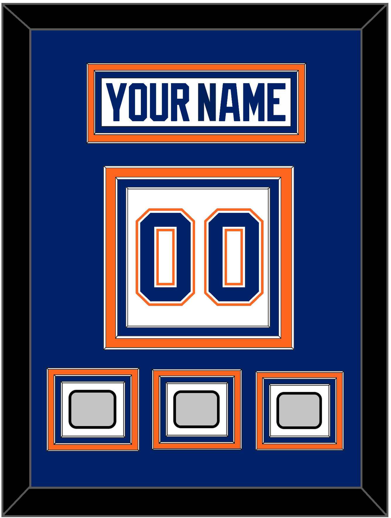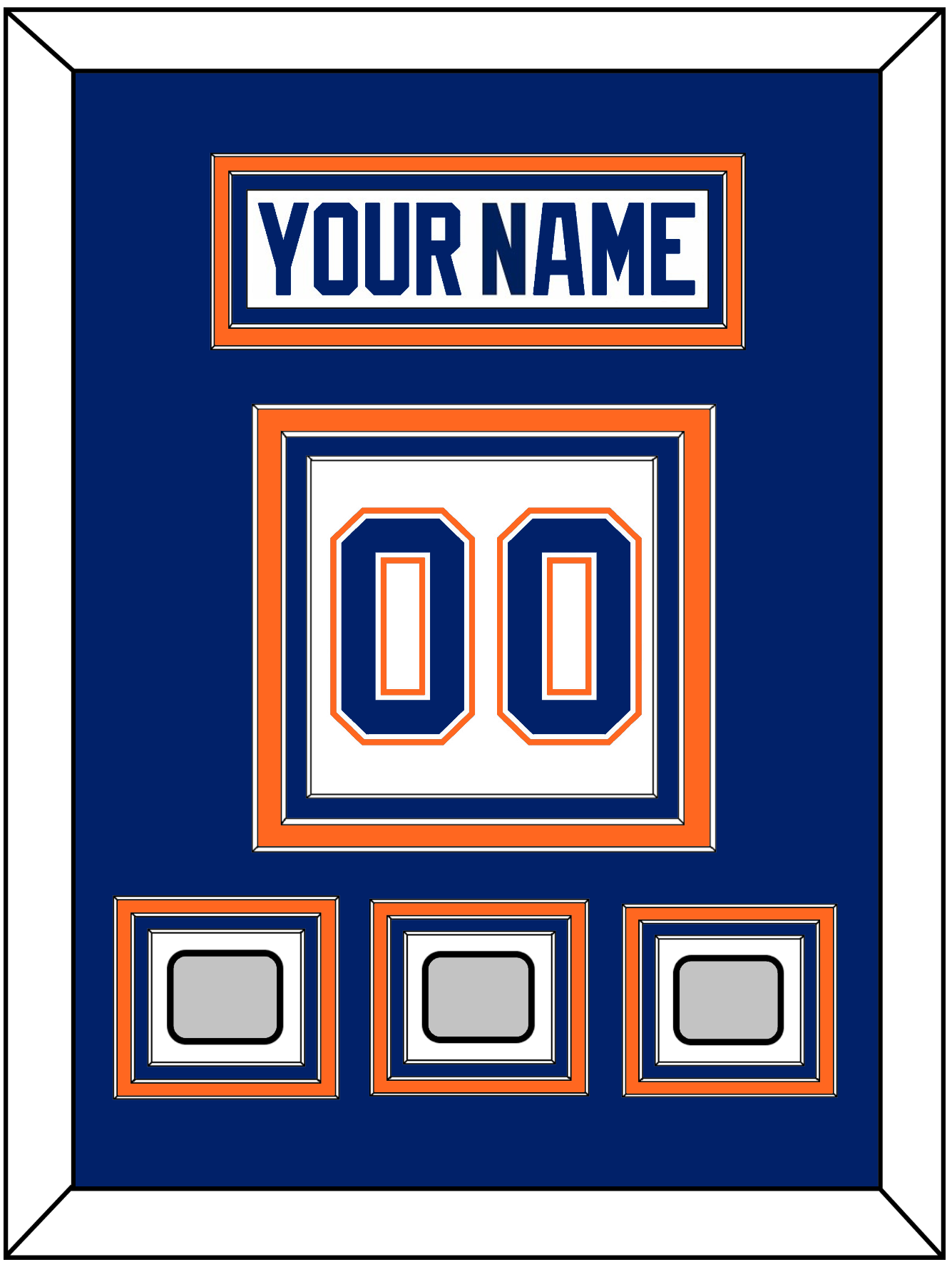 Edmonton Home White Jersey (1981 Through 1994) Nameplate & Numbers (From The Back Of The Jersey) With 1984, 1985 & 1987; 1985, 1987 & 1988; Or 1987, 1988 & 1990 Stanley Cup Champions Patches. Nameplate Is Double Mat Cut: Blue Mat Over An Orange Mat. White Nameplate Mounted On A Blue Mat. To Match The Jersey, Number & Patches Are Triple Mat Cut: Blue Mat Over An Orange Mat Over A Blue Mat, Blue Number & Patches Mounted On A White Mat. White Or Black Frame.