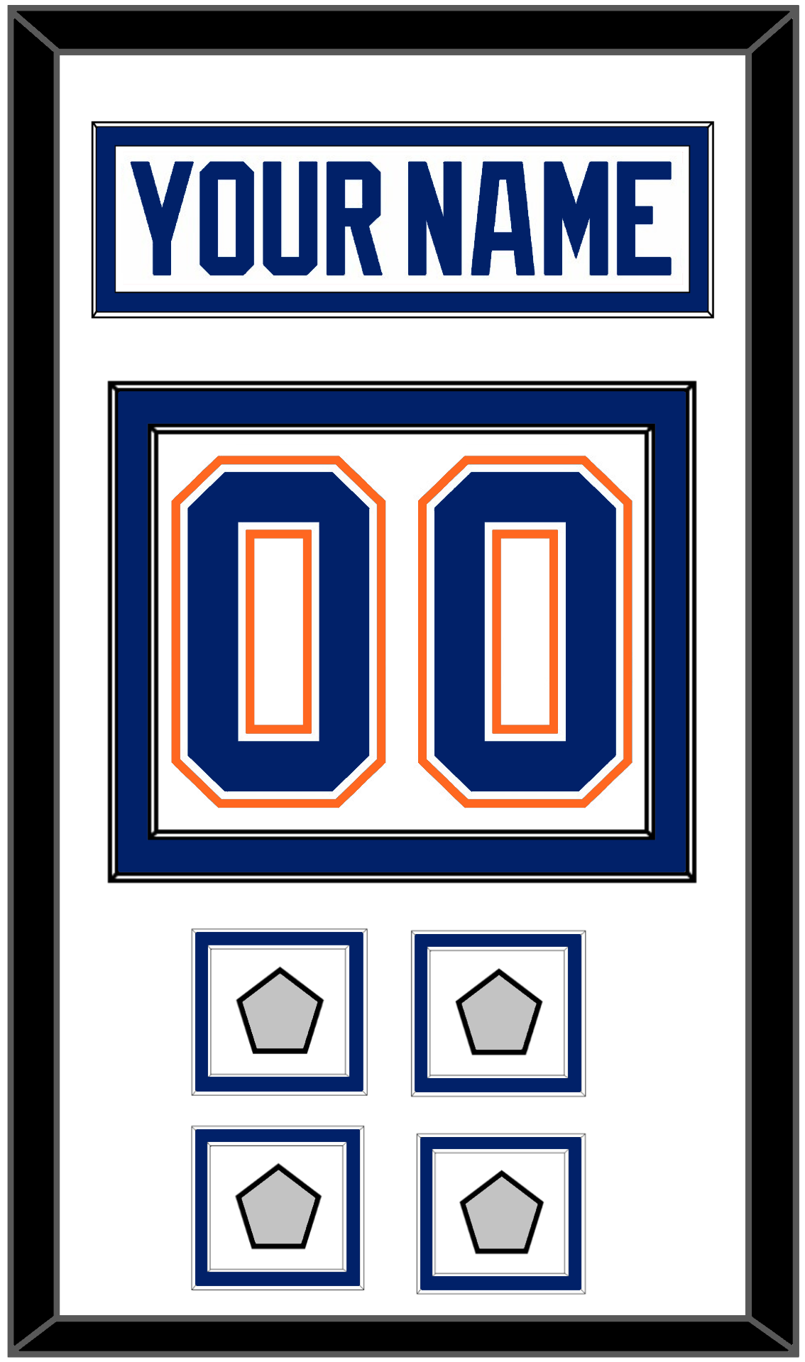 Edmonton Home White Jersey (1981 Through 1994) Nameplate & Numbers (From The Back Of The Jersey) With 1984, 1985, 1987 & 1988; Or 1985, 1987, 1988 & 1990 Stanley Cup Champions Patches. Nameplate Is Single Mat Cut: White Mat With White Nameplate Mounted On A Blue Mat. To Match The Jersey, Number & Patches Are Double Mat Cut: White Mat Over A Blue Mat, Blue Number & Patches Mounted On A White Mat. Black Frame.