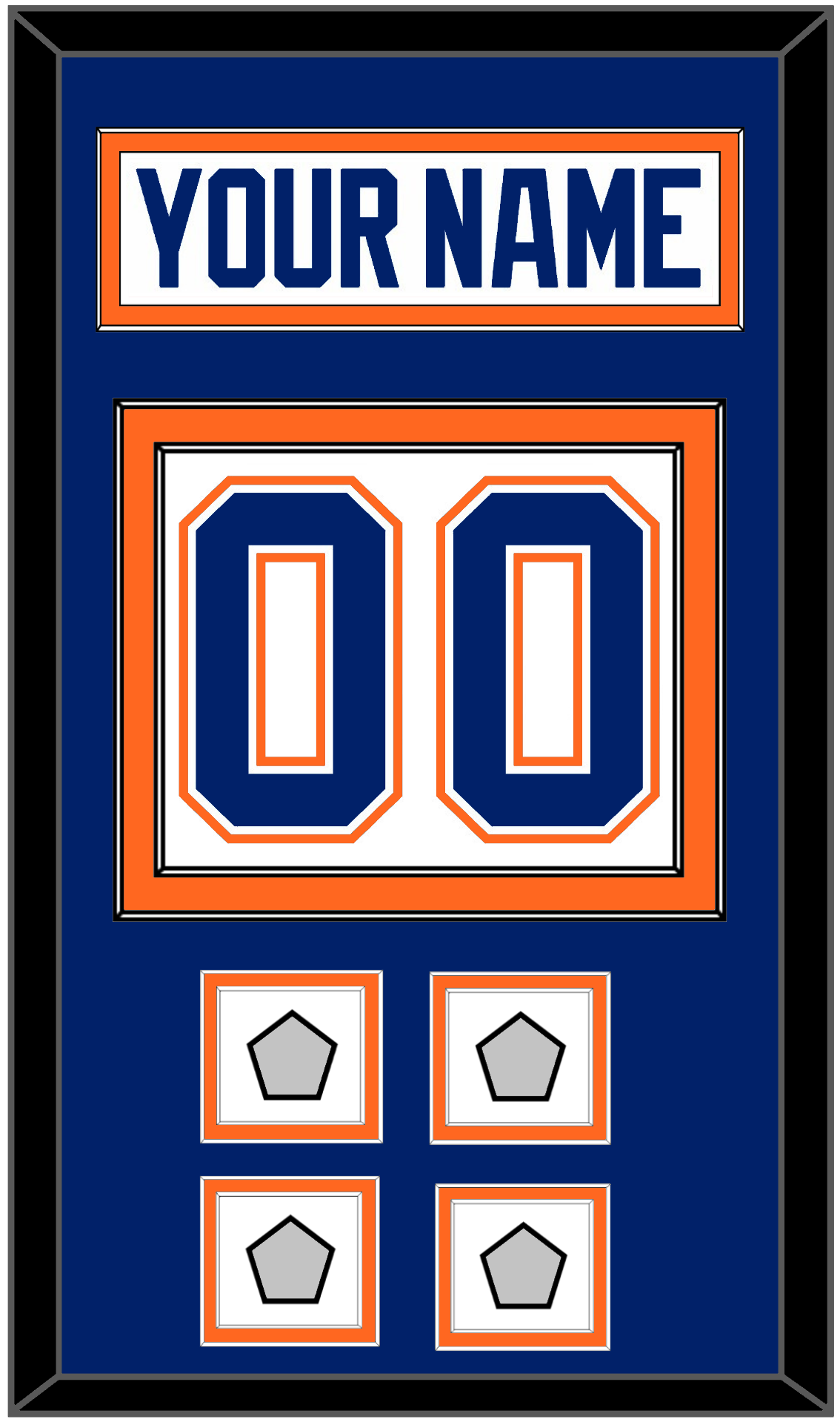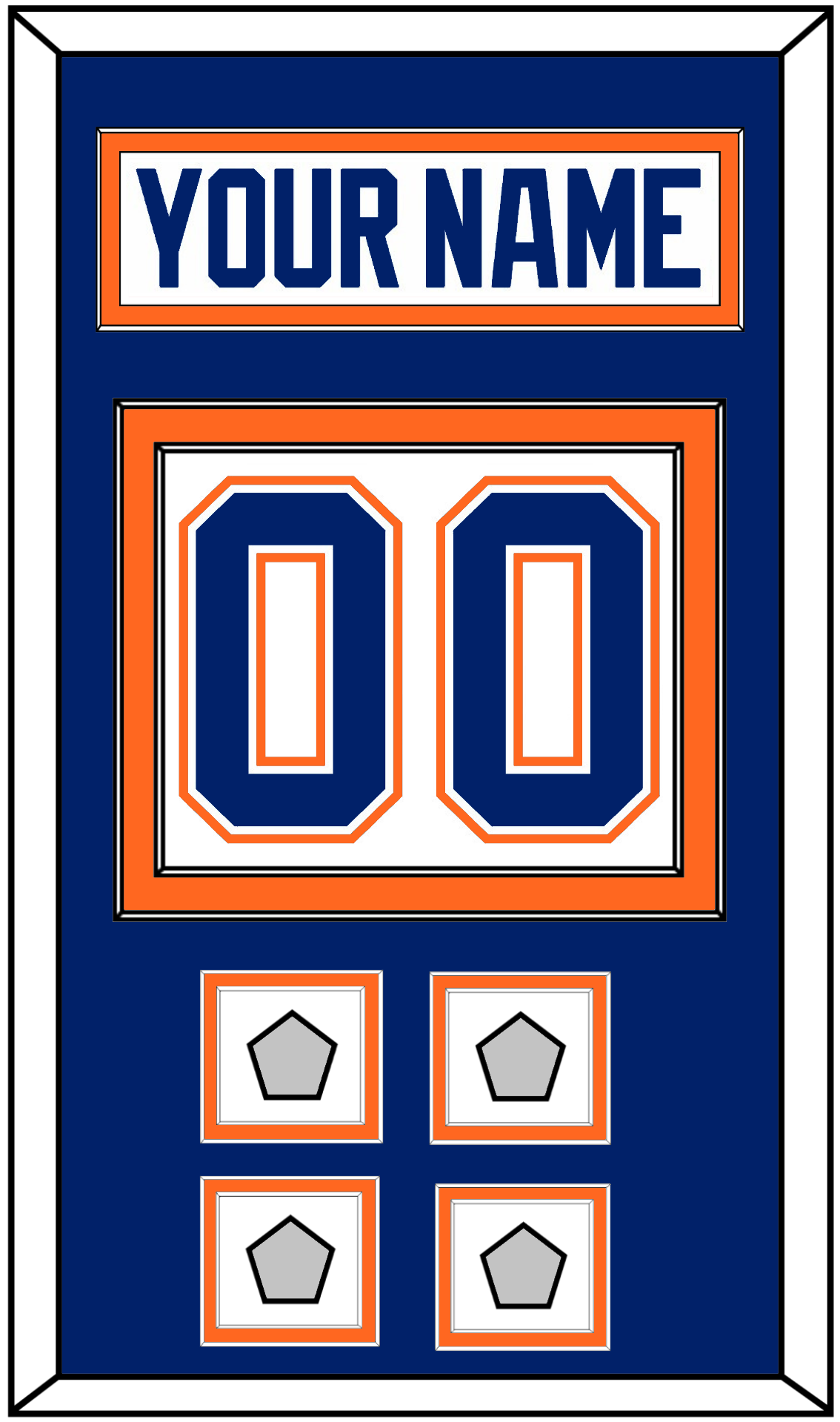 Edmonton Home White Jersey (1981 Through 1994) Nameplate & Numbers (From The Back Of The Jersey) With 1984, 1985, 1987 & 1988; Or 1985, 1987, 1988 & 1990 Stanley Cup Champions Patches. Nameplate Is Single Mat Cut: Blue Mat With White Nameplate Mounted On An Orange Mat. To Match The Jersey, Number & Patches Are Double Mat Cut: Blue Mat Over An Orange Mat, Blue Number & Patches Mounted On A White Mat. White Or Black Frame.