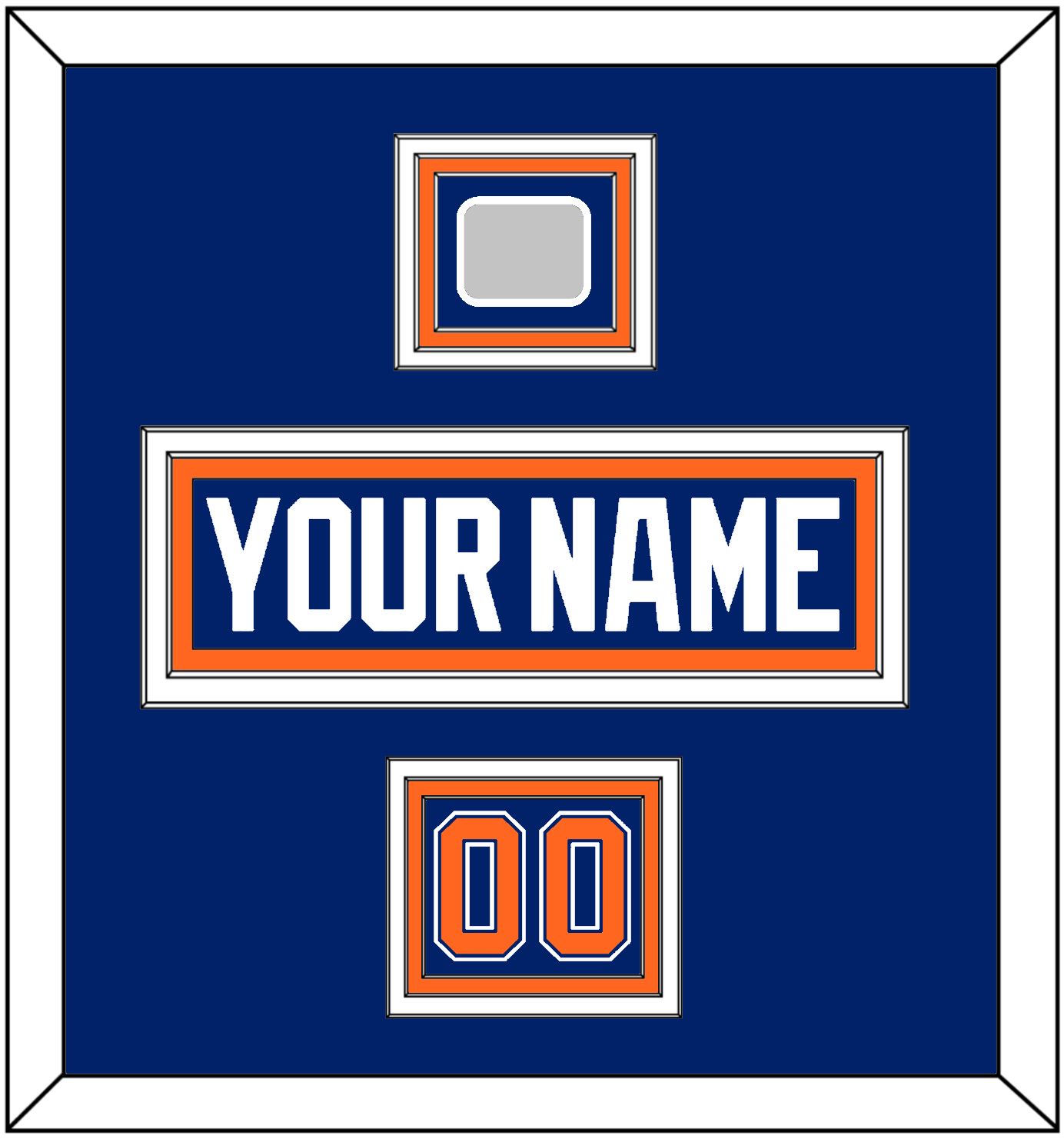 Edmonton Road Blue Jersey (1981 Through 1994) Nameplate, Number(s) From Shoulder, & 1984, 1985, 1987, 1988 Or 1990 Stanley Cup Champions Patch. The Nameplate Is Double Mat Cut: Blue Mat Over A White Mat, Blue Nameplate Mounted On An Orange Mat. To Match The Jersey, The Numbers & Patches Are Triple Mat Cut: Blue Mat Over A White Mat Over An Orange Mat, White Numbers & Patch Mounted On A Blue Mat. White Or Black Frame.