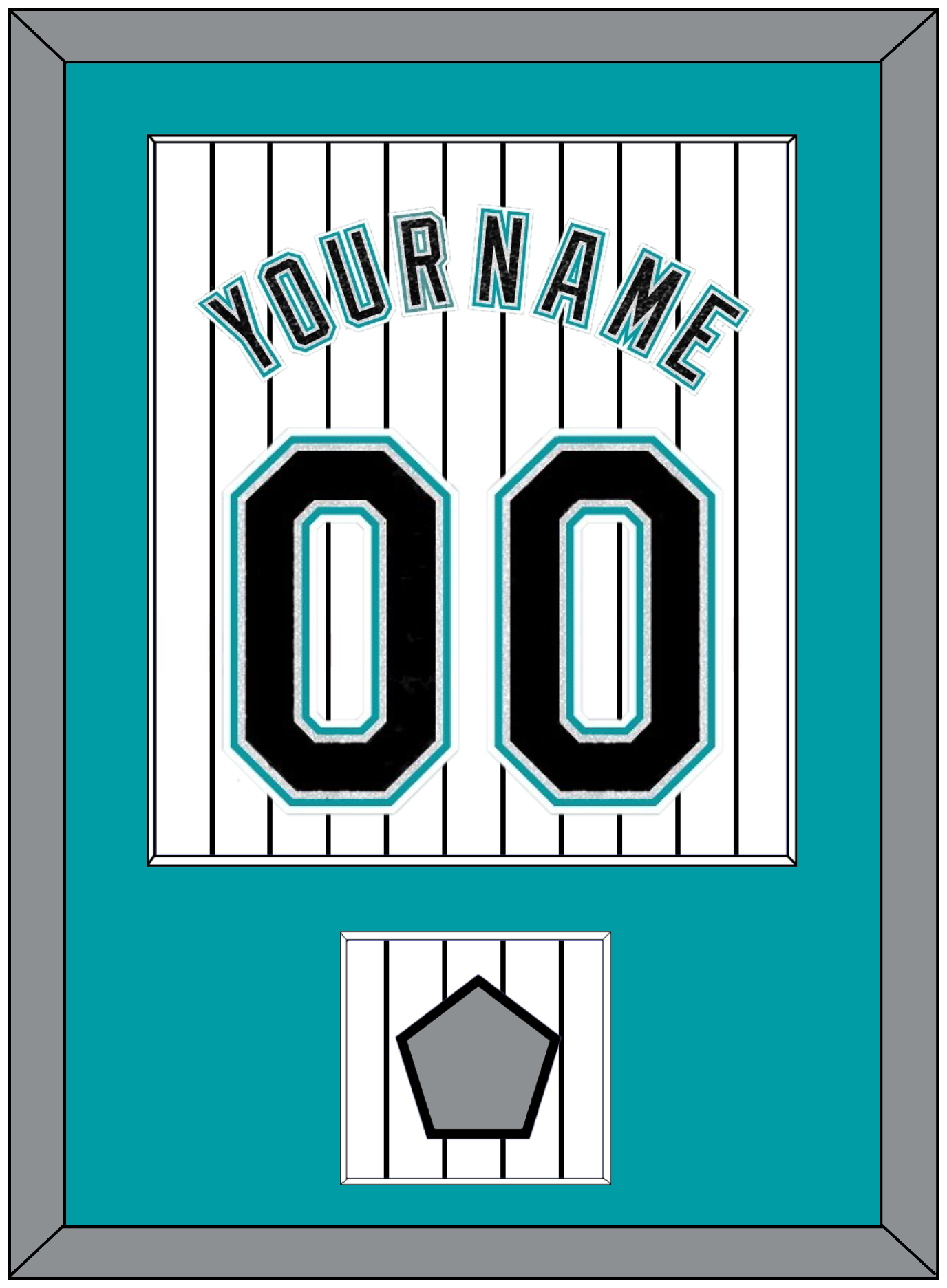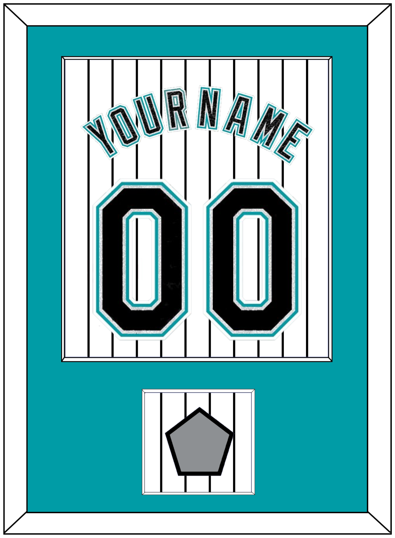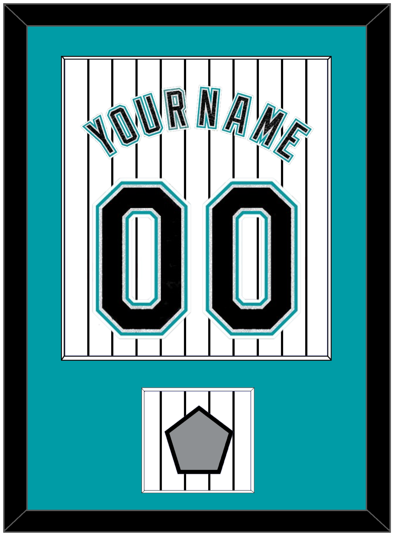 Florida Home White Pinstripes Jersey (2003 Through 2011) Name & Number With 2003 World Series Champions Patch. Single Mat: Teal Mat With Black Name, Number & Patch Mounted On A Pinstripe Background. Black, White Or Silver (Metal) Frame.