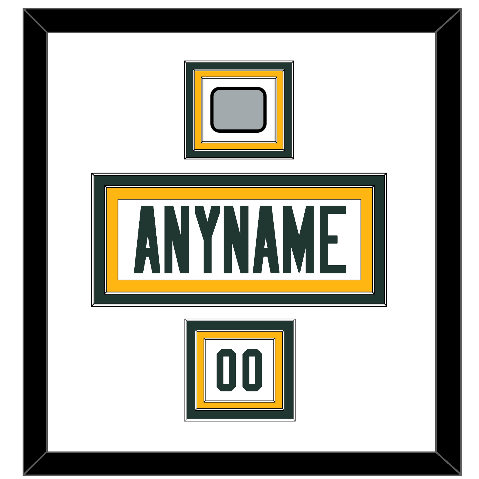 Green Bay Road White Jersey Nameplate, Number(s) From Shoulder, & Super Bowl XXXI Or XLV Jersey Patch. The Nameplate Is Double Mat Cut: White Mat Over A Green Mat, White Nameplate Mounted On A Gold Mat. To Match The Jersey, The Numbers & Patches Are Triple Mat Cut: White Mat Over A Green Mat Over A Gold Mat, Green Numbers & Patch Mounted On A White Mat. Black Frame.