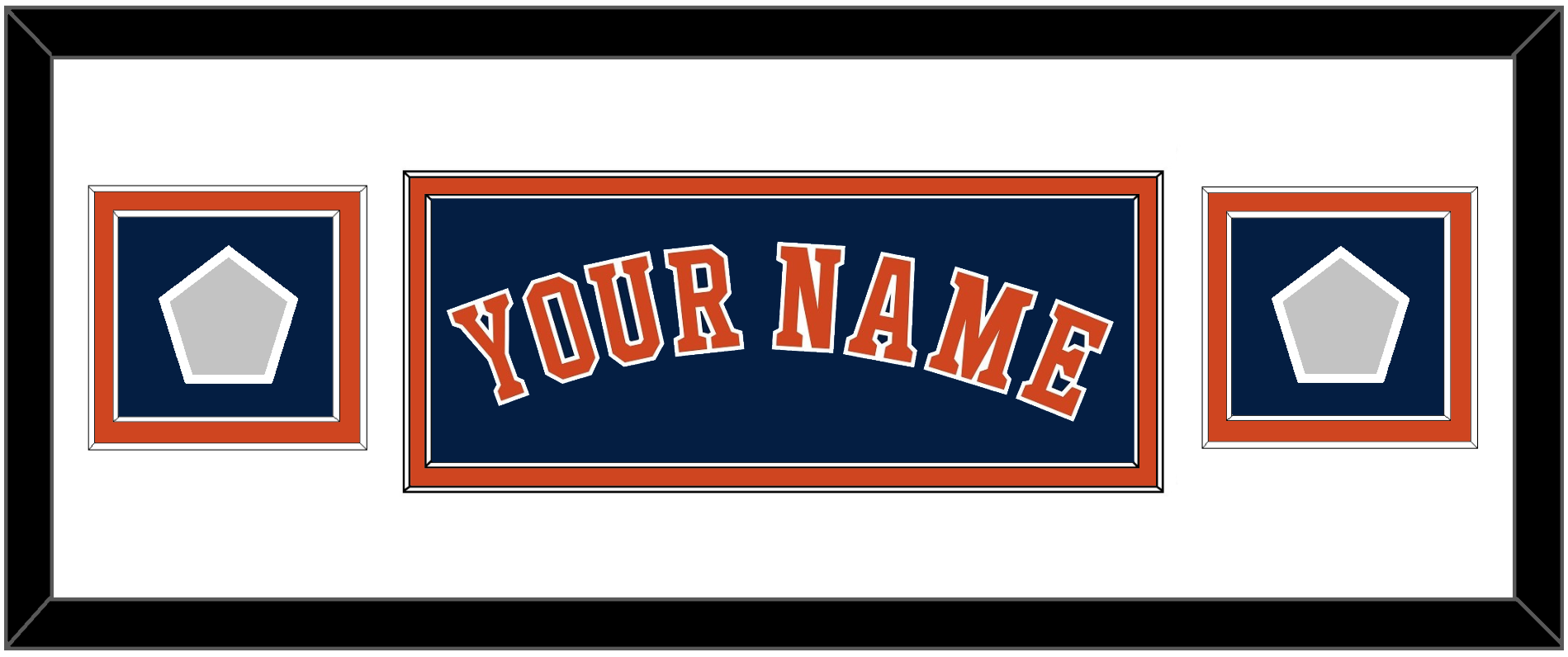 Houston Alternate Blue Jersey Name With 2017 & 2022 World Series Jersey Patches. Double Mat Cut: White Mat Over An Orange Mat. Orange Name & Patches Mounted On A Blue Mat. Black Frame.