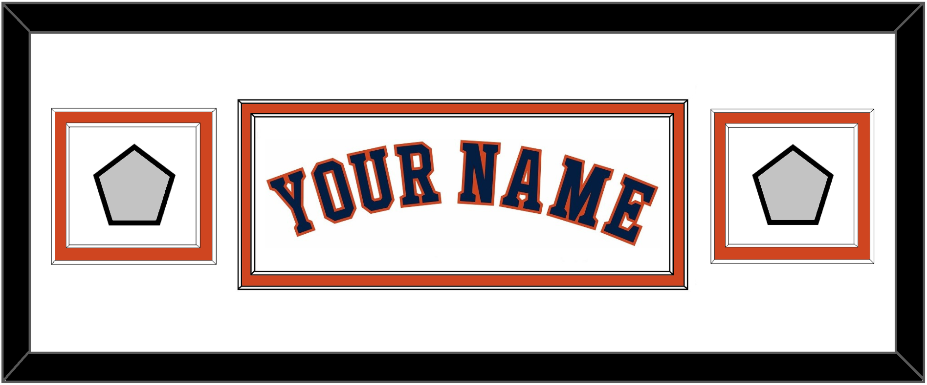 Houston Home White Jersey Name With 2017 & 2022 World Series Jersey Patches. Double Mat Cut: White Mat Over An Orange Mat. Blue Name & Patches Mounted On A White Mat. Black Frame.