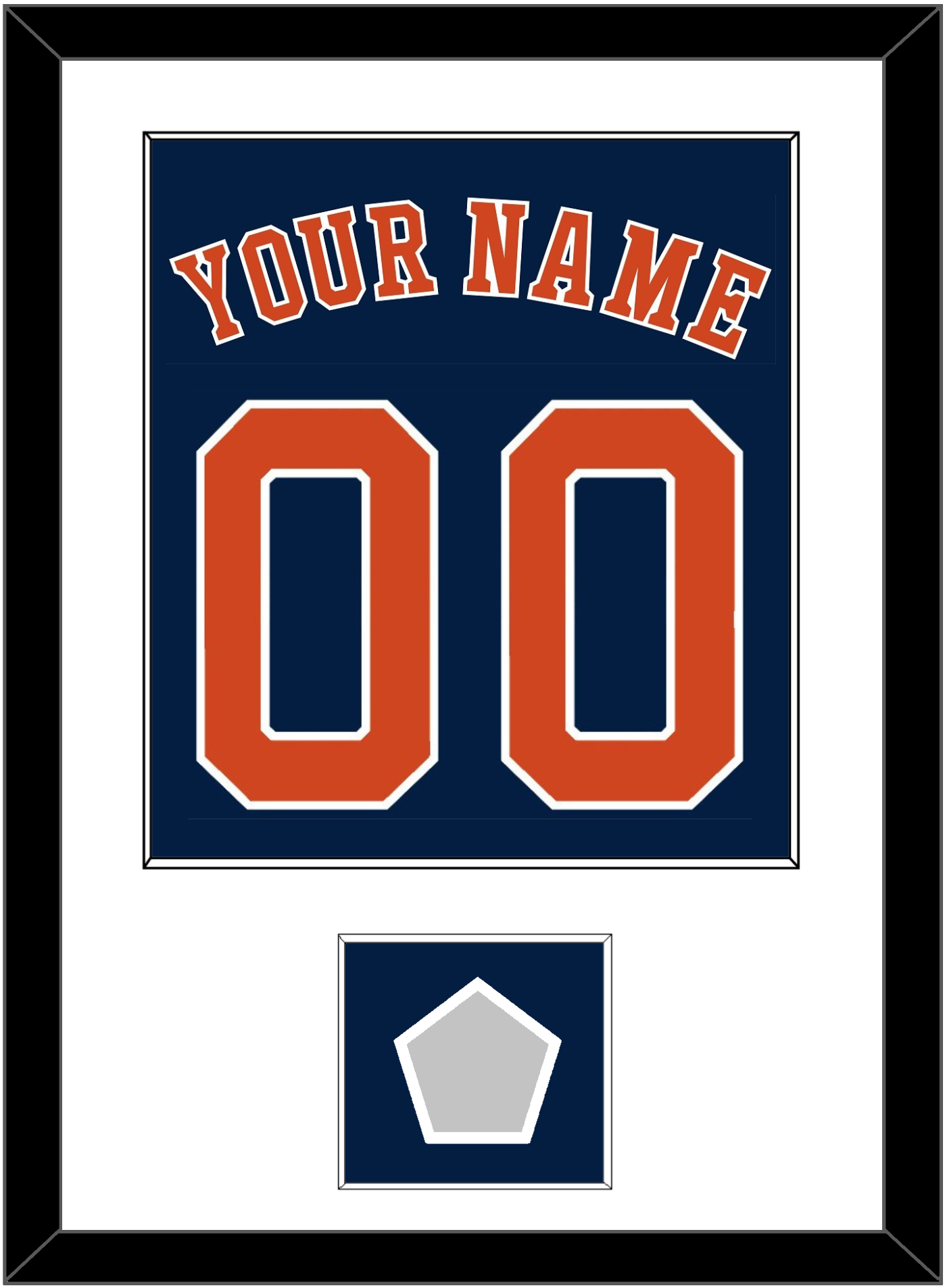 Houston Alternate Blue Jersey Name & Number With 2017 Or 2022 World Series Jersey Patch. Single Mat Cut: White Mat With Orange Name, Number & Patch Mounted On A Blue Mat. Black Frame.