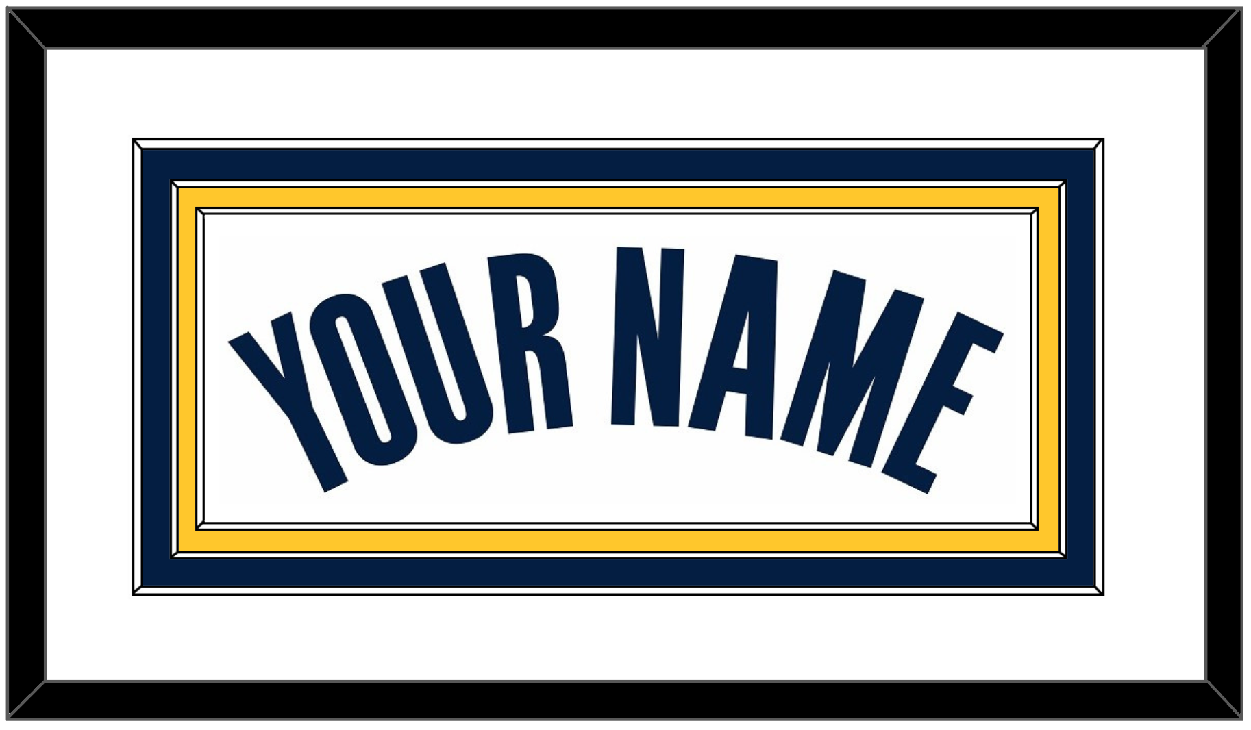 Indiana Home White Jersey (2006 Through 2017) Name. Double Mat: White Mat Over A Navy Blue Mat Over A Gold Mat. Navy Blue Name Mounted On White Mat. Black Frame.