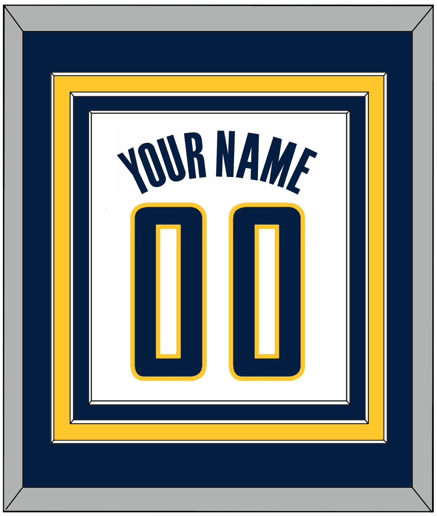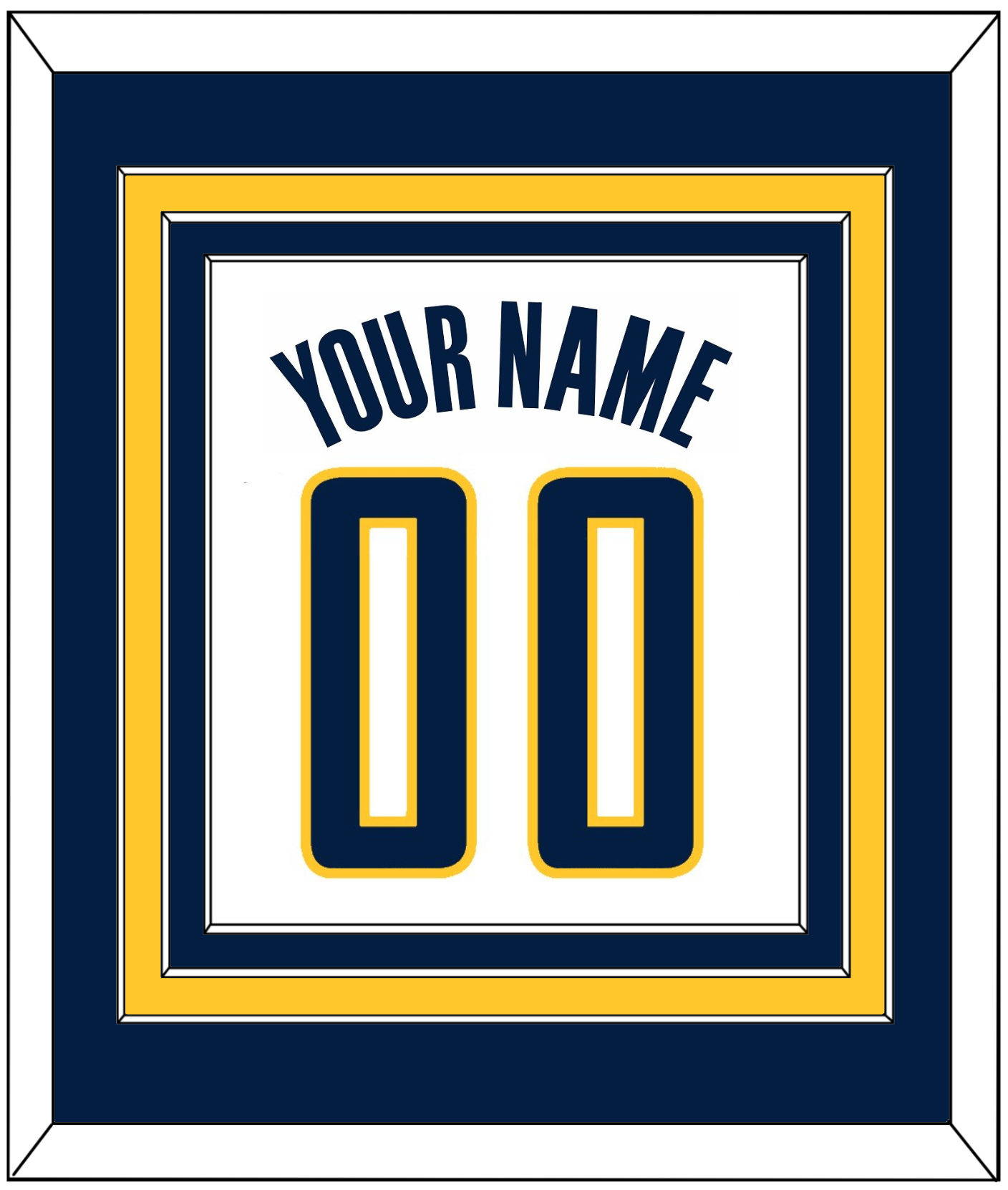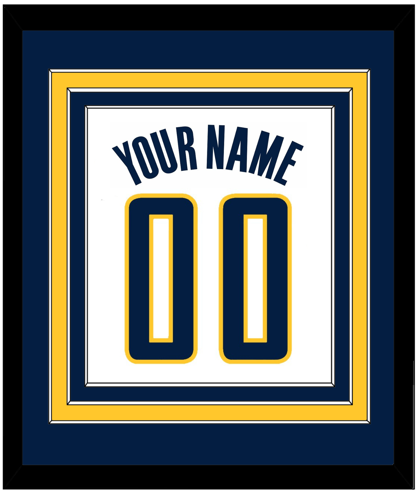 Indiana Home White Jersey (2006 Through 2017) Name & Number. Triple Mat: Navy Blue Mat Over A Gold Mat Over A Navy Blue Mat. Navy Blue Name And Number Mounted On White Mat. White, Black Or Silver (Metal) Frame.