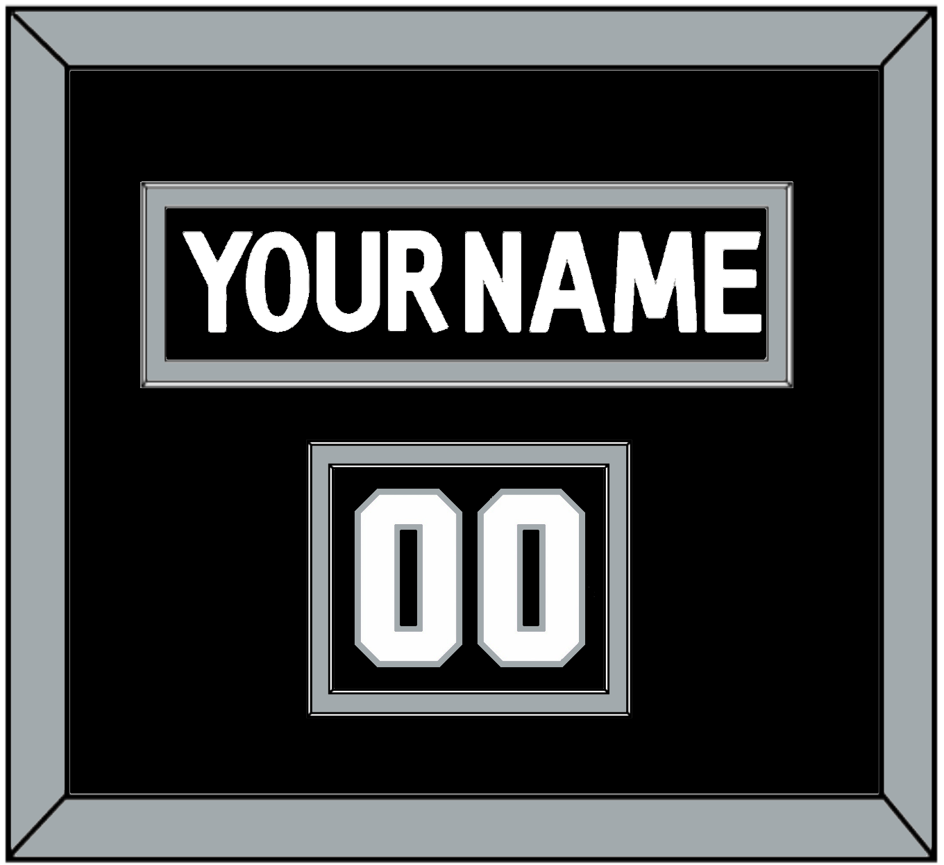 Los Angeles Home Black Jersey (2011 Through 2017) Nameplate & Numbers From Shoulder - The Nameplate Is Single Mat Cut: Black Nameplate Mounted On Silver Mat. To Match The Jersey, The Numbers Are Double Mat Cut: Black Mat Over A Silver Mat. White Numbers Mounted On A Black Mat. White Or Silver (Metal) Frame.