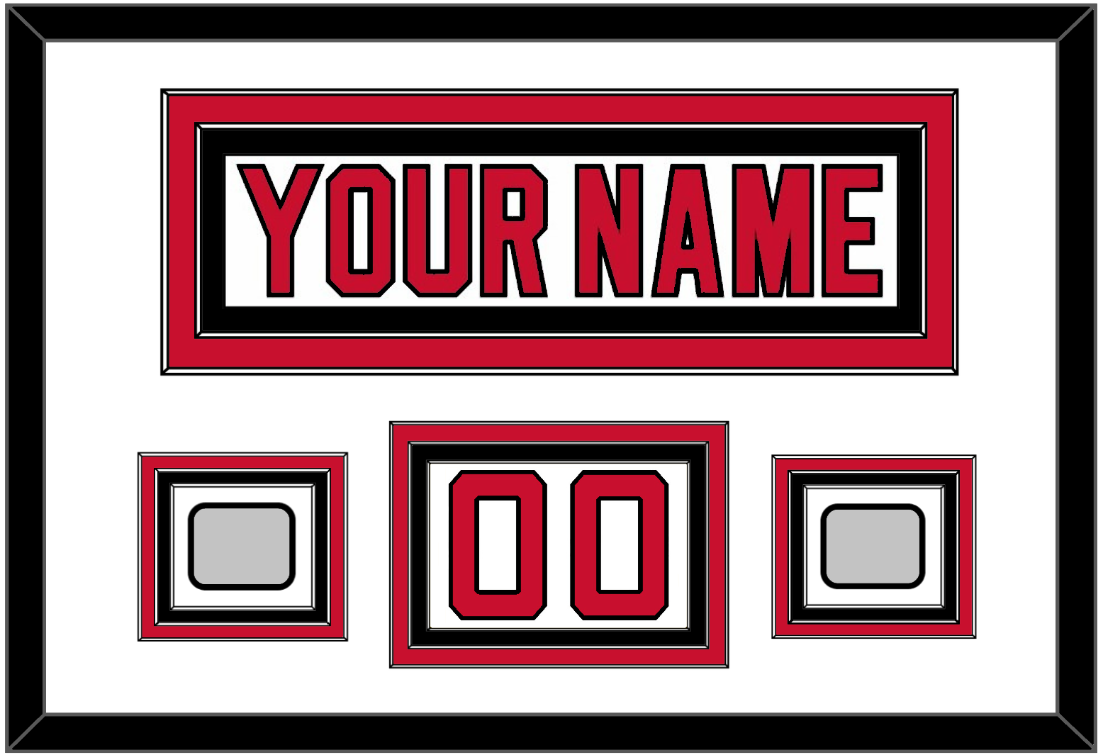 New Jersey Home White Jersey (1992 Through 2007) Nameplate, Number(s) From Shoulder, And 1995 & 2000 Or 2000 & 2003 Stanley Cup Finals Jersey Patches. The Nameplate Is Double Mat Cut: White Mat Over A Red Mat, White Nameplate Mounted On A Black Mat. To Match The Jersey, The Numbers & Patches Are Triple Mat Cut: White Mat Over A Red Mat Over A Black Mat, Red Numbers & Patches Mounted On A White Mat. Black Frame.