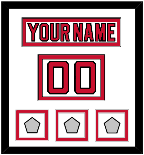 New Jersey Home White Jersey (1992 Through 2007) Nameplate, Number And Stanley Cup Finals 1995, 200 & 2003 Jersey Patches. Nameplate Is Single Mat Cut: White Mat With White Nameplate Mounted On A Red Mat. To Match The Jersey, Numbers And Patches Are Double Mat Cut: White Mat Over A Red Mat. Red Numbers And Patches Are Mounted On A White Mat. Black Frame.