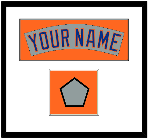New York Road Gray Jersey (1982 Through 1986) Nameplate With 1986 World Series Patch. Single Mat Cut: White Mat With Gray Nameplate & Patch Mounted On An Orange Mat. Black Frame.