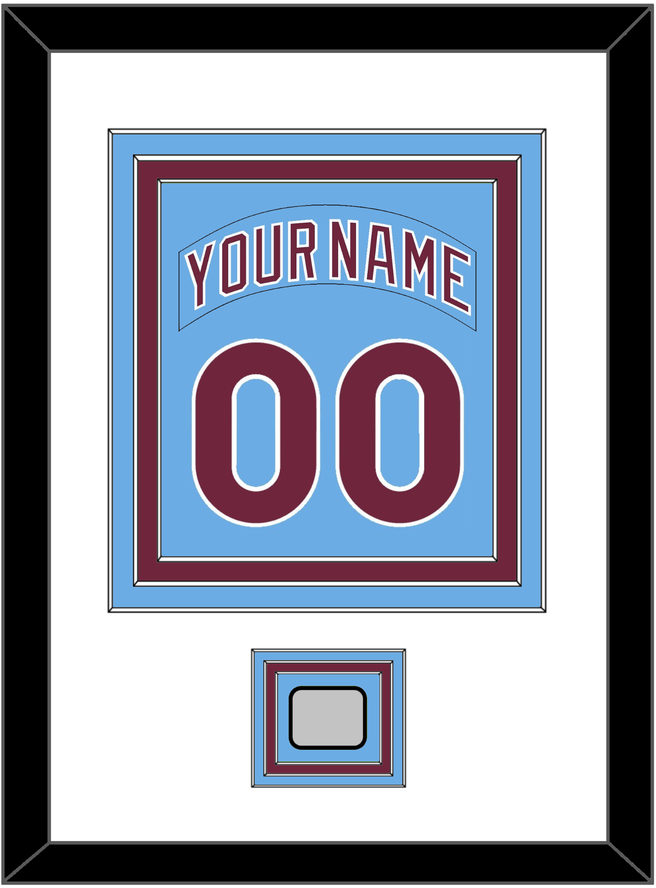 Philadelphia Road Powder Blue Jersey (1973 Through 1986) Nameplate, Number & 1980 World Series Patch Triple Mat Cut: White Mat Over A Powder Blue Mat Over A Maroon Mat. Powder Blue Nameplate And Maroon Number Mounted On A Powder Blue Mat. Black Frame.