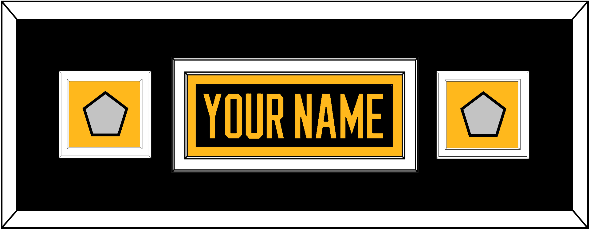 Pittsburgh Road Black Jersey (1988 Through 1992) Nameplate With 2 Stanley Cup Champions Patches (1991 & 1992, 2009 & 2016 Or 2016 & 2017). Double Mat Cut: Black Mat Over A White Mat. Black Nameplate & Patches Mounted On A Gold Mat. White Frame.