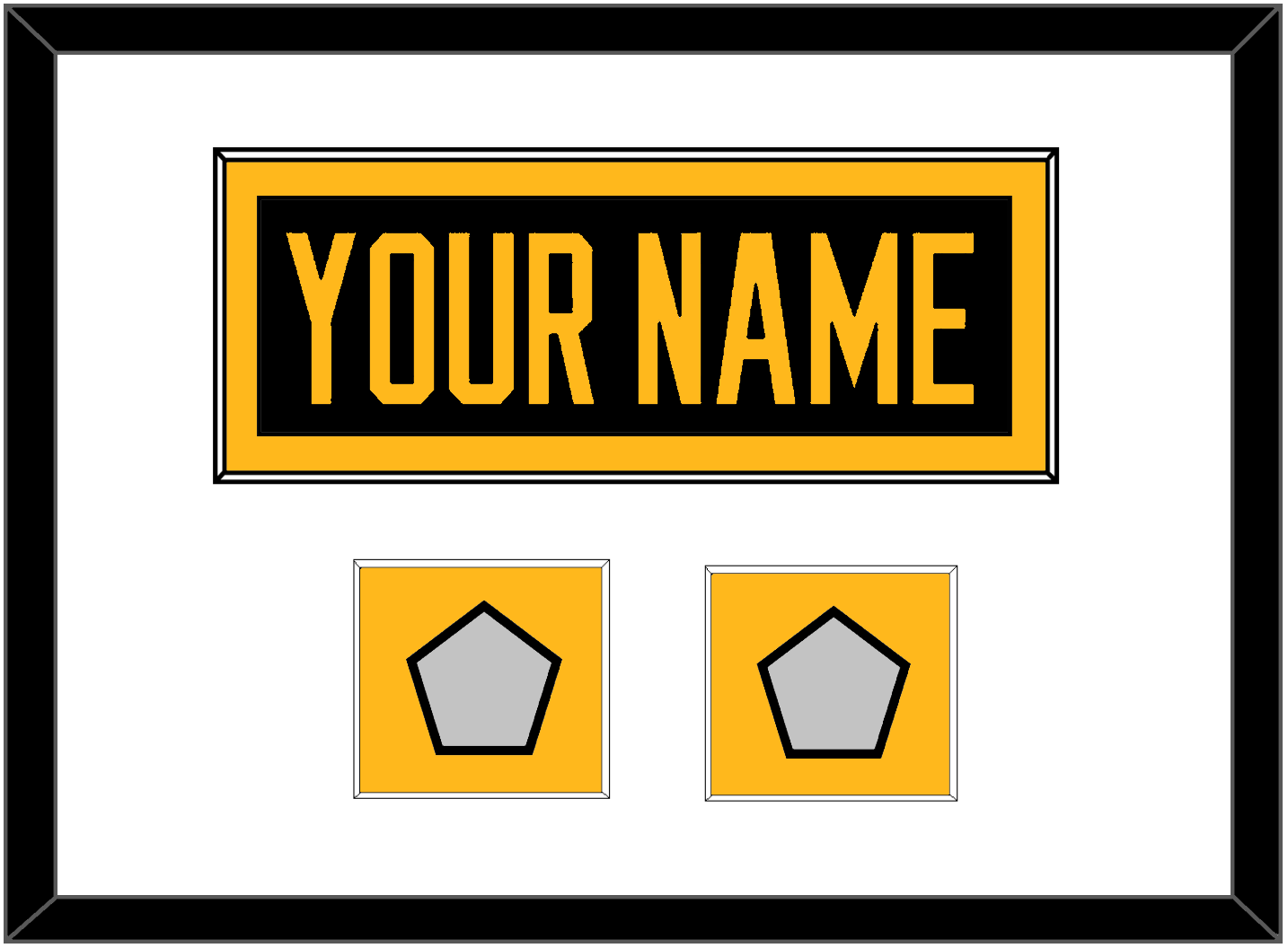 Pittsburgh Road Black Jersey (1988 Through 1992) Nameplate With 2 Stanley Cup Champions Patches (1991 & 1992, 2009 & 2016 Or 2016 & 2017).  Single Mat Cut:  White Mat With Black Nameplate & Patches Mounted On A Gold Mat.  Black Frame.