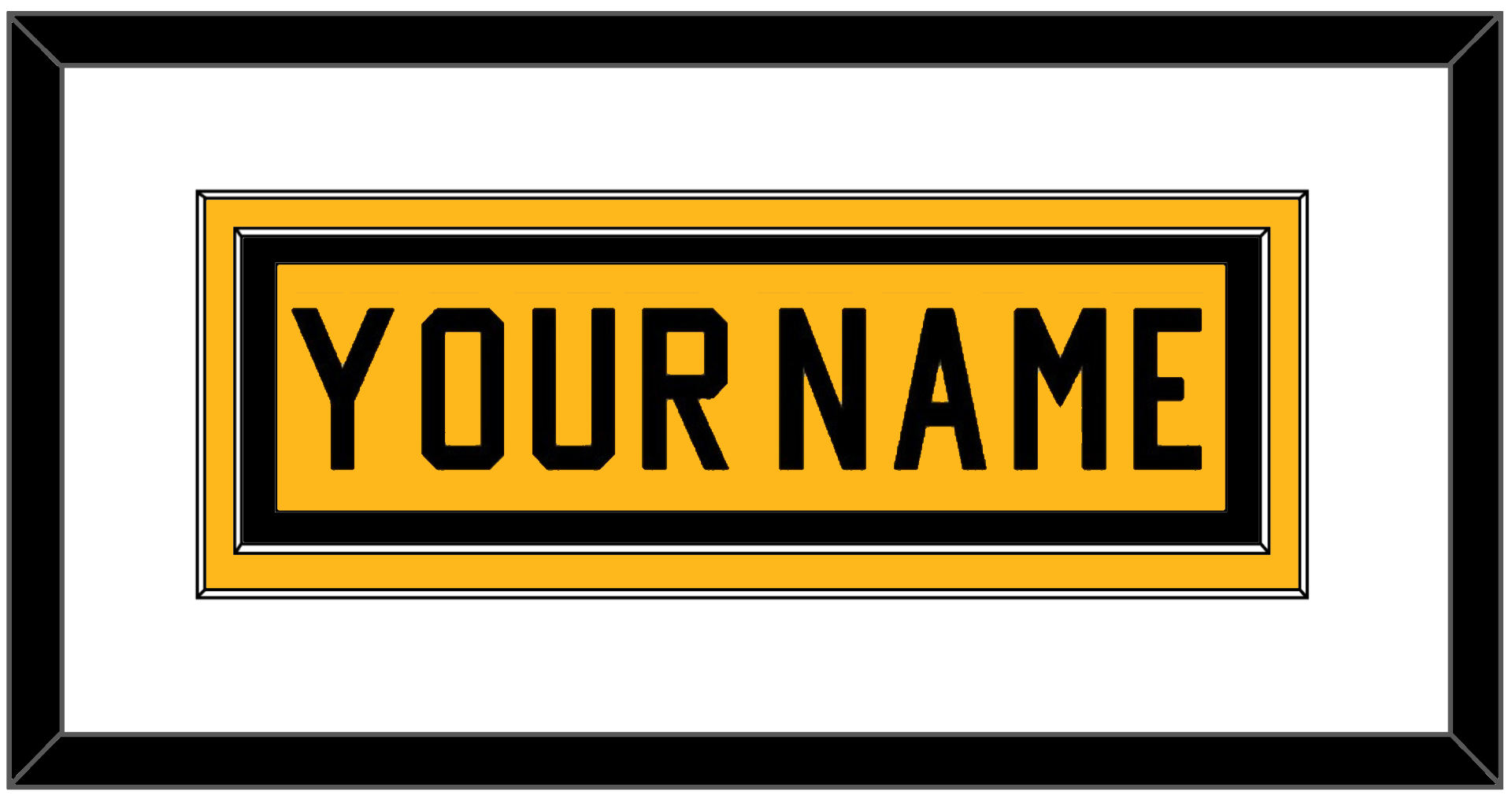 Pittsburgh Home Gold Jersey (1983 Through 1984) Nameplate.  White Mat Over Gold Mat, Gold Nameplate Mounted On Black Mat.  Black Frame.