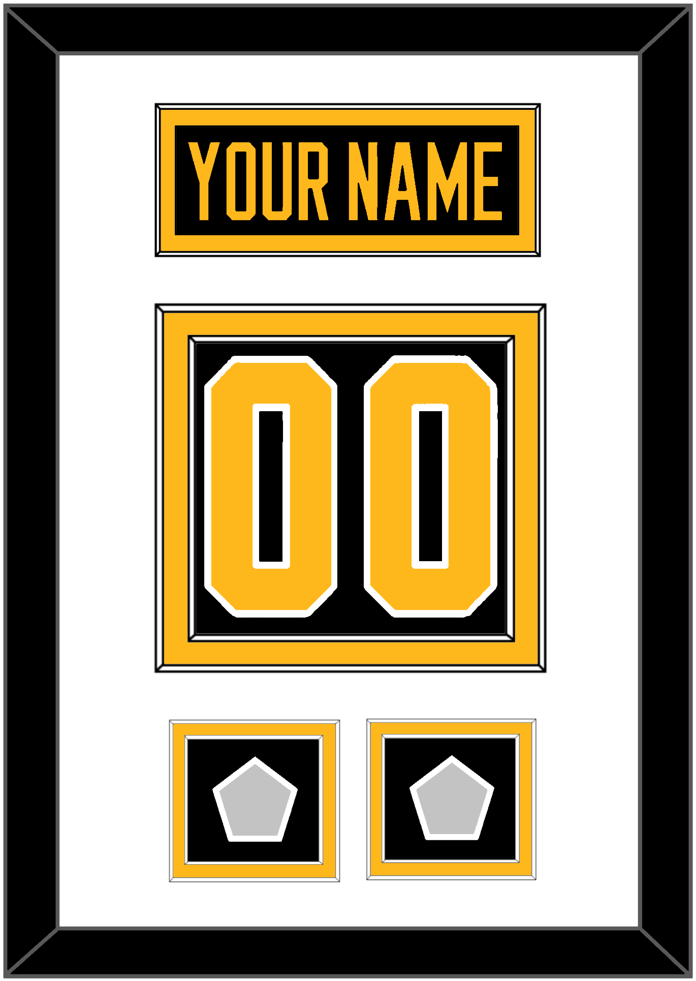 Pittsburgh Home Black Jersey Nameplate & Numbers (From The Back Of The Jersey) With 2 Stanley Cup Champions Patches, 1991 & 1992, 2009 & 2016 Or 2016 & 2017. Nameplate Is Single Mat Cut: White Mat With Black Nameplate Mounted On A Gold Mat. To Match The Jersey, Number & Patches Are Double Mat Cut: White Mat Over A Gold Mat, Gold Number & Patches Mounted On A Black Mat. Black Frame.