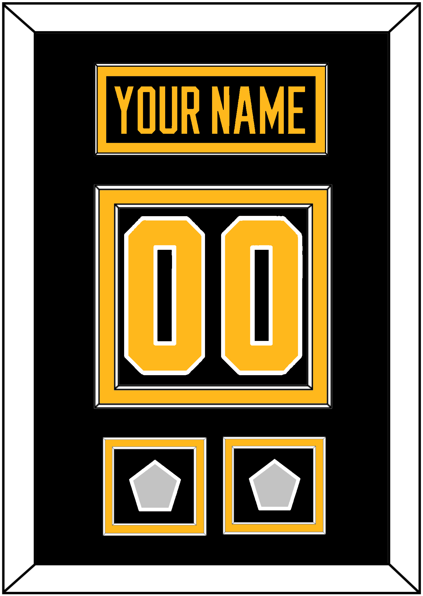 Pittsburgh Road Black Jersey (1988 Through 1992) Nameplate & Numbers (From The Back Of The Jersey) With 2 Stanley Cup Champions Patches, 1991 & 1992, 2009 & 2016 Or 2016 & 2017. Nameplate Is Single Mat Cut: Black Mat With Black Nameplate Mounted On A Gold Mat. To Match The Jersey, Number & Patches Are Double Mat Cut: Black Mat Over A Gold Mat, Gold Number & Patches Mounted On A Black Mat. White Frame.
