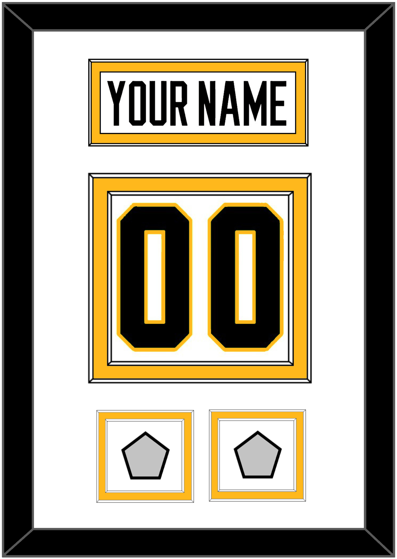 Pittsburgh Road White Jersey Nameplate & Numbers (From The Back Of The Jersey) With 2 Stanley Cup Champions Patches, 1991 & 1992, 2009 & 2016 Or 2016 & 2017. Nameplate Is Single Mat Cut: White Mat With White Nameplate Mounted On A Gold Mat. To Match The Jersey, Number & Patches Are Double Mat Cut: White Mat Over A Gold Mat, Black Number & Patches Mounted On A White Mat. Black Frame.