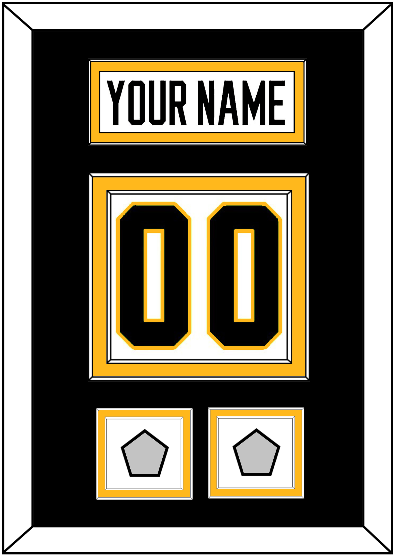 Pittsburgh Home White Jersey (1988 Through 1992) Nameplate & Numbers (From The Back Of The Jersey) With 2 Stanley Cup Finals Patches, 1991 & 1992, 2009 & 2016 Or 2016 & 2017. Nameplate Is Single Mat Cut: Black Mat With White Nameplate Mounted On A Gold Mat. To Match The Jersey, Number & Patches Are Double Mat Cut: Black Mat Over A Gold Mat, Black Number & Patches Mounted On A White Mat. White Frame.